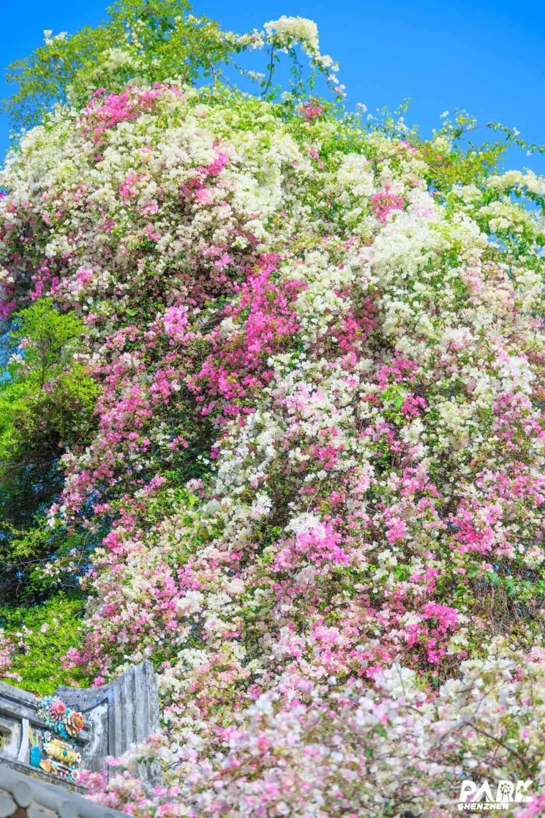 粉白色的花瀑从五米高的树墙倾泻而下