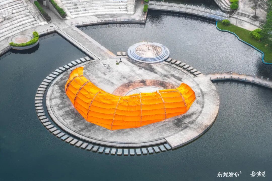 湖心小岛上,橙色的“降落伞”轻轻悬浮,“毛织小镇”的织物串联成轻盈的波浪,承载着城市变迁的记忆。
