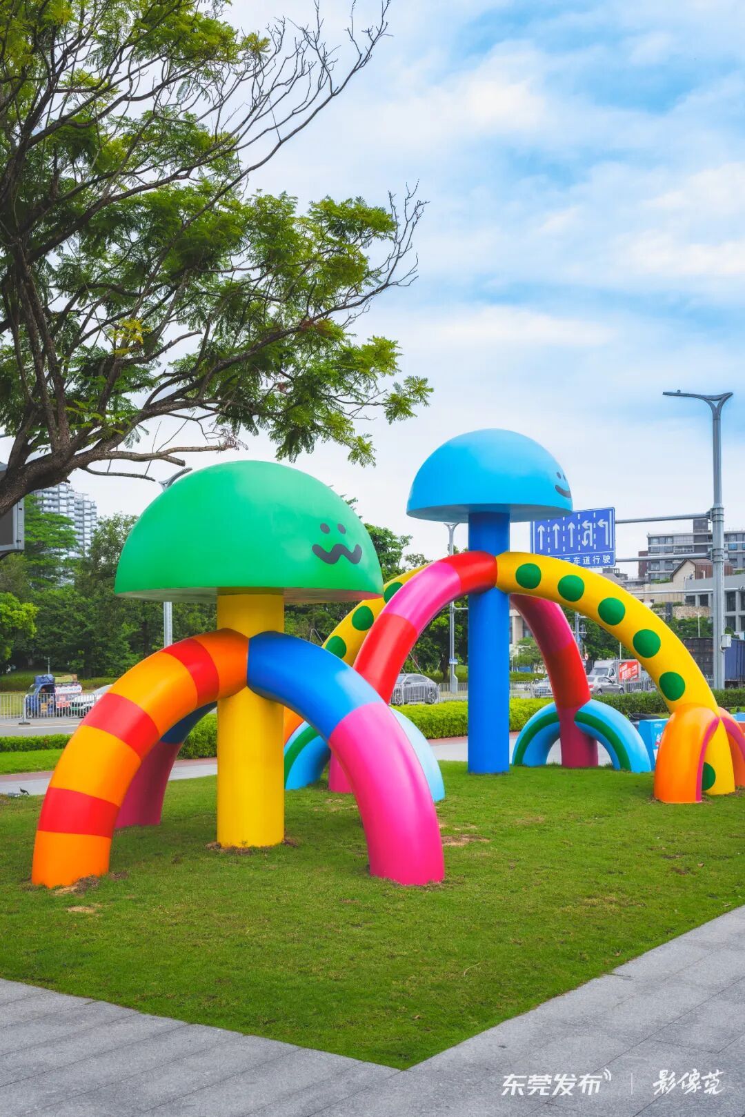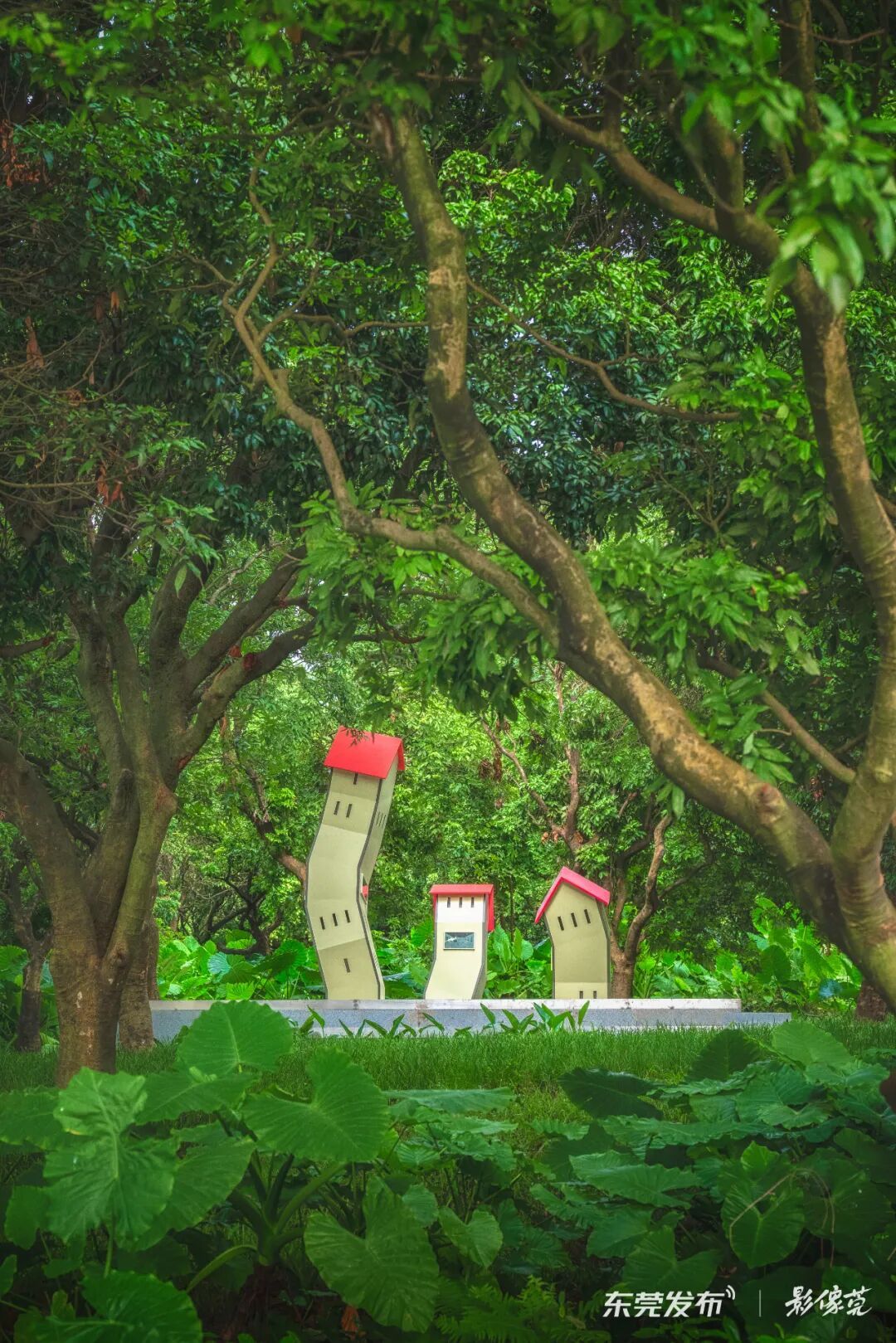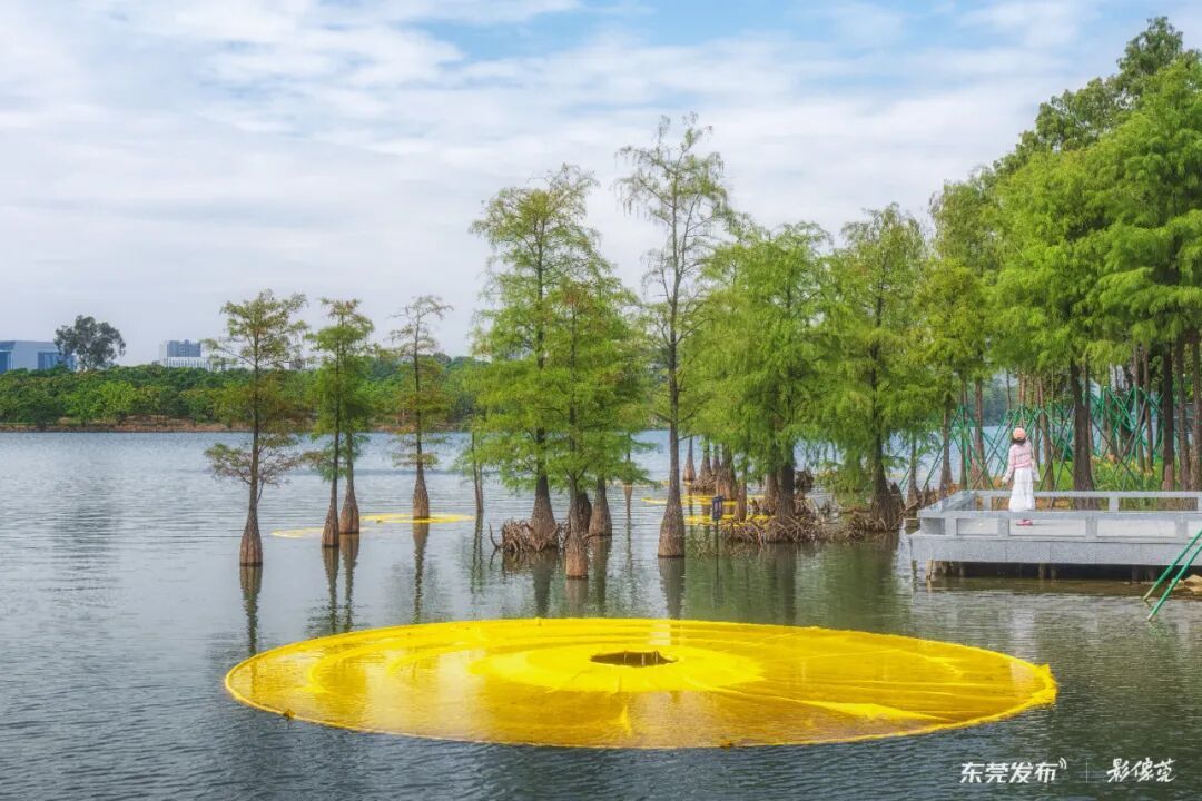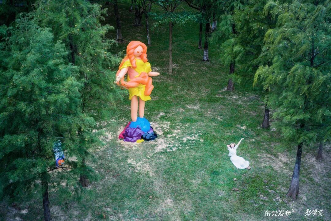 在松山湖悠兰里文化艺术街区,被称为“色彩魔术师”的艺术家,把落羽杉“上色”成了奇幻的艺术品。让这片儿童友好街区的草地上,长出了一种轻松治愈的生命力。