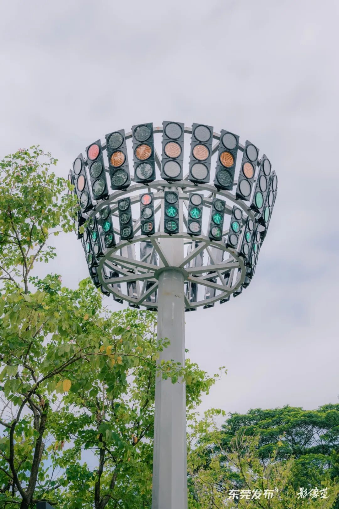 松湖烟雨景点入口的树丛间,纵向排列的交通信号灯围合成一道圆环,如同一座巨大的“时钟”,坐落在道路旁。