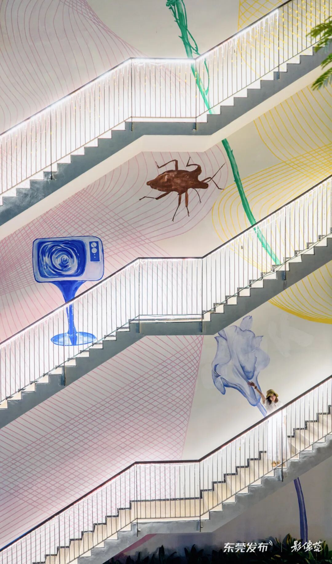 穿行在4层楼高的巨大墙绘前,顺着台阶,如同进入一幅水彩画。亚洲和南美洲的迁居植物,和显微镜层层叠印,科技和自然一同生长。