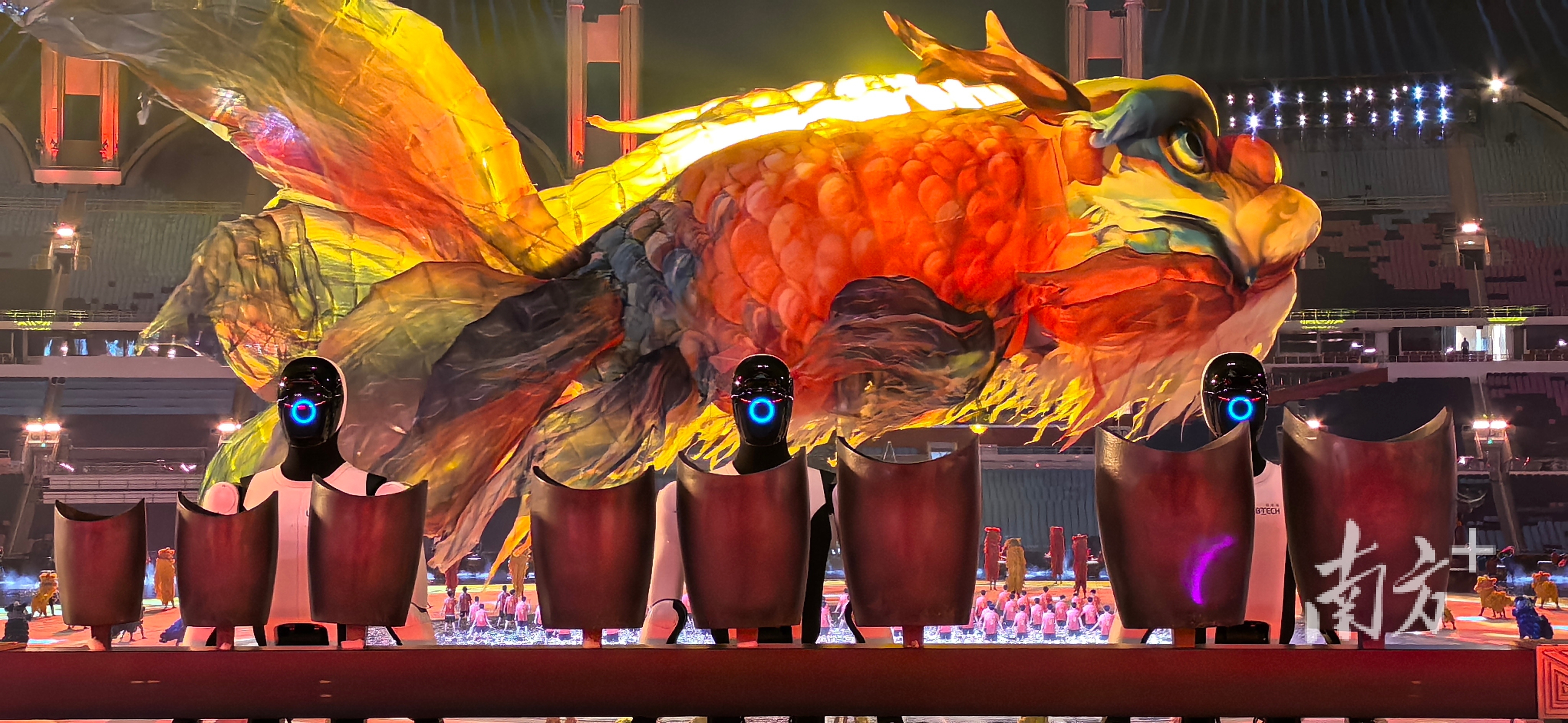 三个机器人整齐划一地敲响铜句鑃仿制品,现代科技让两千年前的声音回响在广东奥体中心体育场。