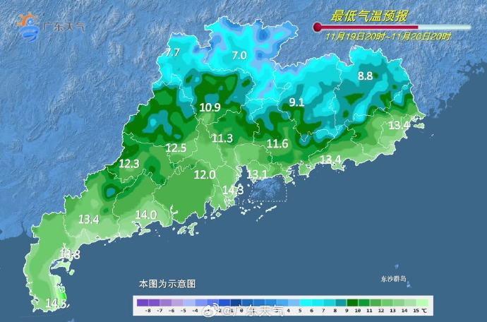 具体天气预报为,19日,粤北市县阴天间多云,中南部市县阴天间多云,有零星小雨。气温维持在较低状态,天气寒凉。