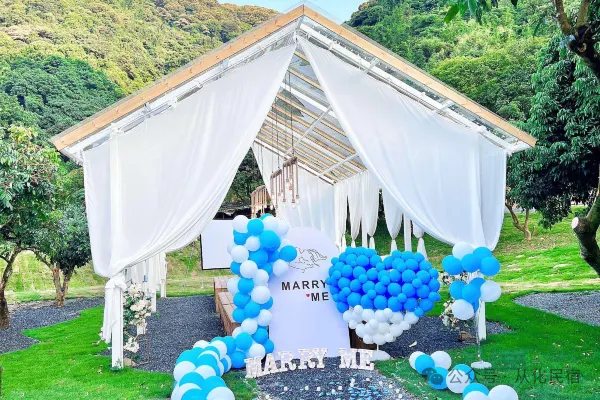白日蓝白气球、纯白纱幔,是求婚告白的甜蜜秘境;夜幕暖灯流转,与星光山色相融,成了山野间的浪漫小天地。