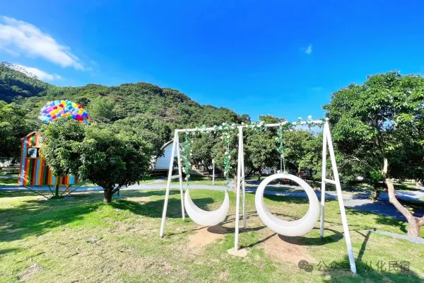 纯白的环形秋千架着藤蔓,在蓝天绿树的映衬下清新又出片;一旁彩色小屋与气球簇增添了几分童趣,山风掠过,坐在秋千上轻轻晃动,仿佛连时光都变得温柔。