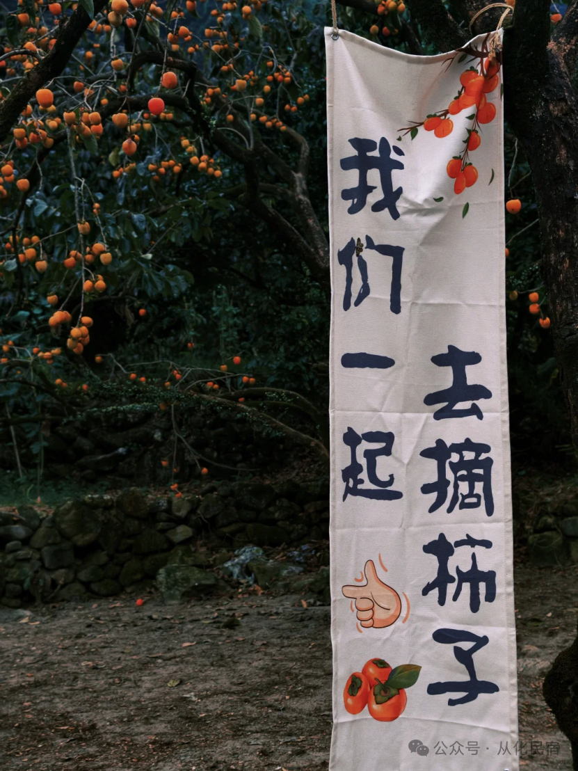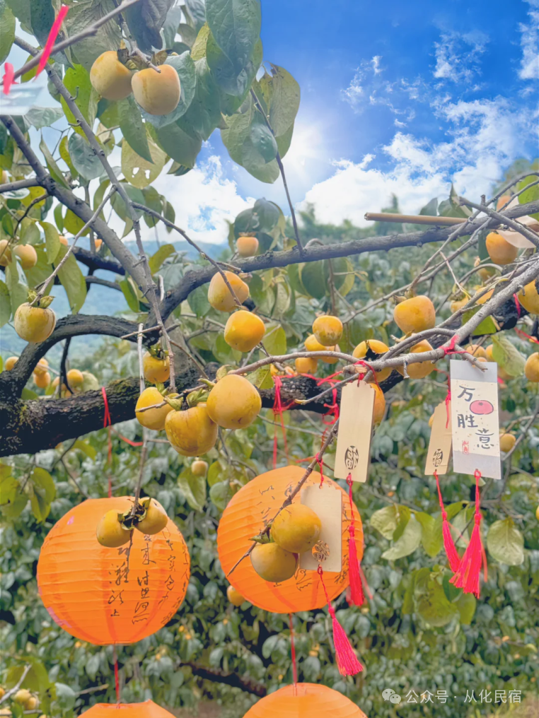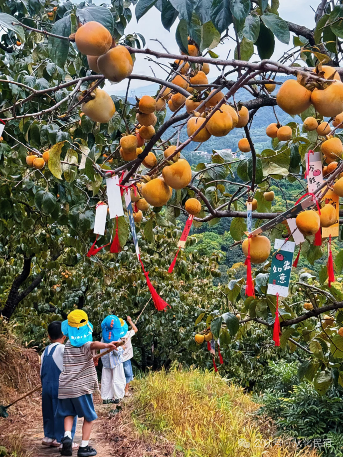 逛完柿子园,10分钟抵达罗洞工匠小镇,当漫山柿果如橙红灯笼缀满枝头,与金黄稻田相映,随手定格皆是日系田园诗。