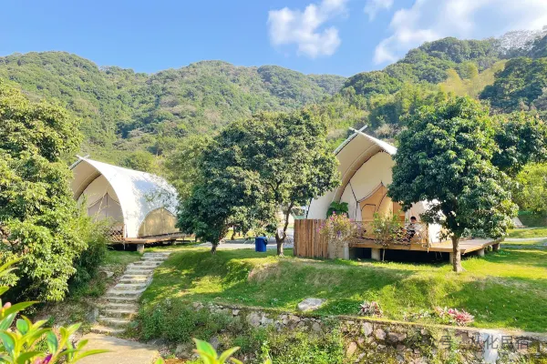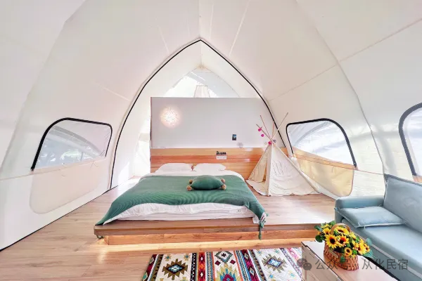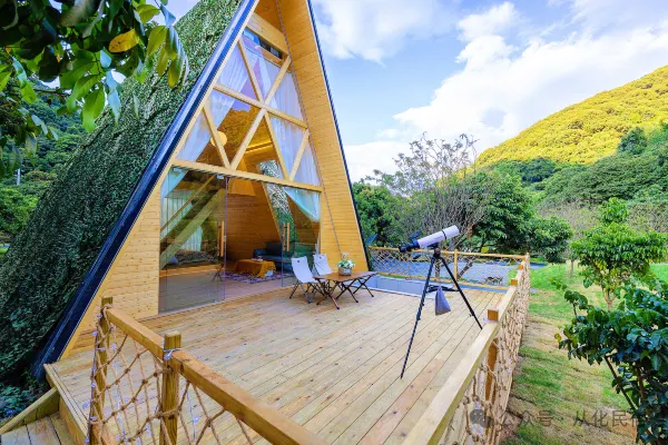 三角木屋顶着绿植 “草帽”,在青山翠谷间如积木般错落;白色贝壳帐篷藏在树影里,与木栈道、草坪茶歇区相映成趣。