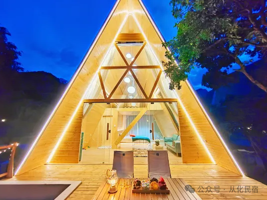 三角木屋被暖光勾勒出童话轮廓,星空下泡汤浪漫至极;屋内原木空间温馨明亮,滑梯房型更是把童趣拉满,在山林夜色里,每一处都藏着 “住进童话” 的惊喜。