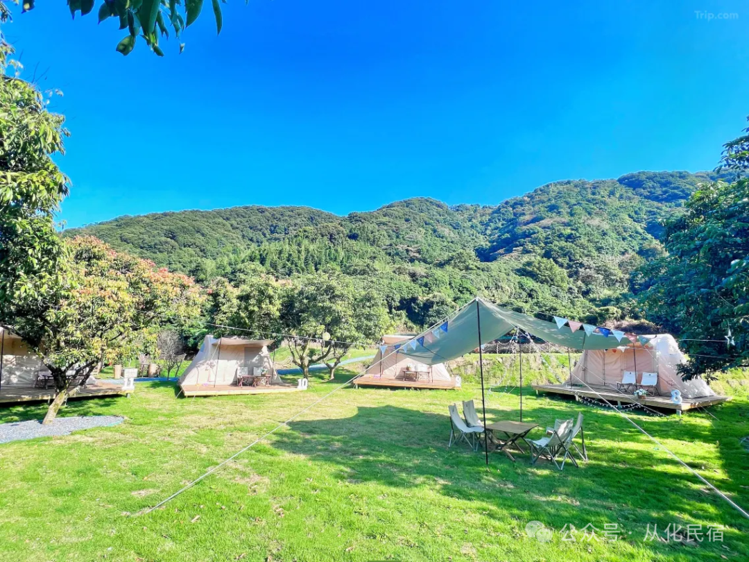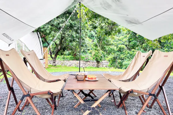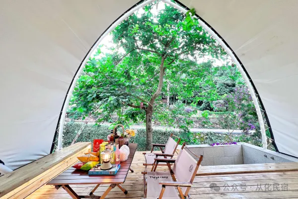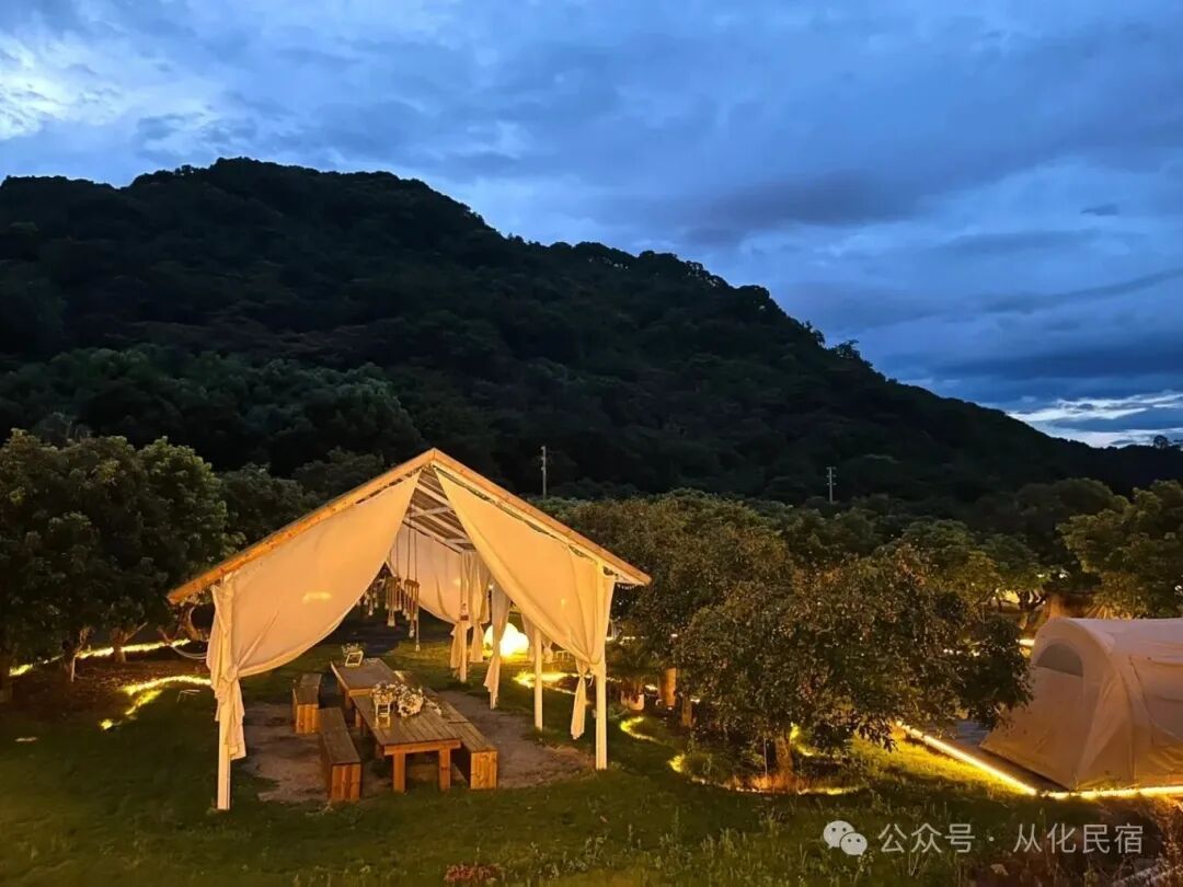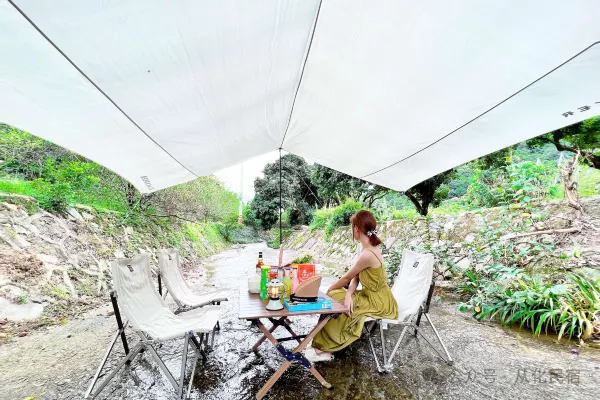 在绿草如茵的草坪上,白色天幕下摆着桌椅,繁花树影作伴,山风掠过满是惬意;或在溪畔撑起纯白天幕,溪水潺潺从脚边流过,品茶小酌间尽是野趣。
