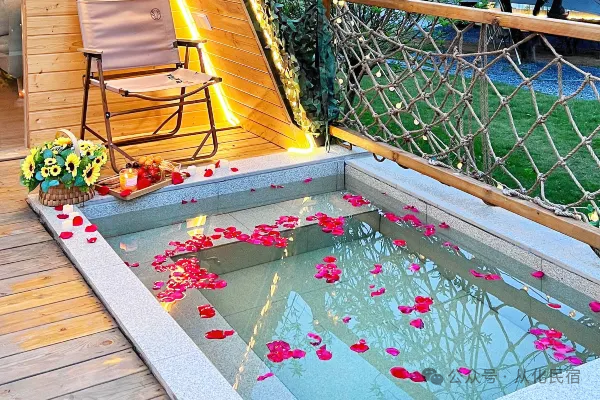 三角木屋以原木打造,露台配天文望远镜,私汤池飘满玫瑰花瓣,推窗就是层峦翠色;还有带民族风地毯的帐篷房,让你在自然怀抱里睡个好觉。