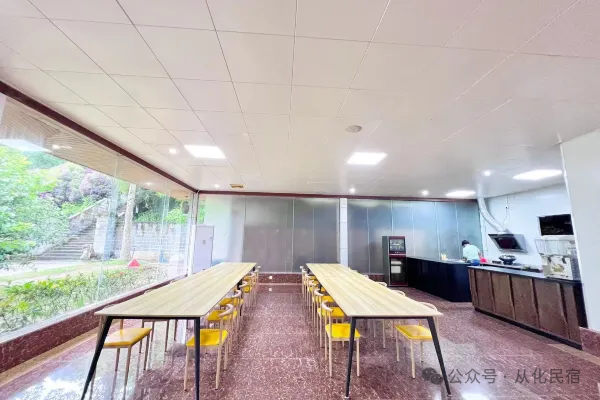 餐厅内长桌黄椅简约明亮,大窗将山林绿意引入;大堂藤编沙发雅致温馨,同样借景于窗外葱郁,让每一次用餐、休憩都伴着山野的清新。