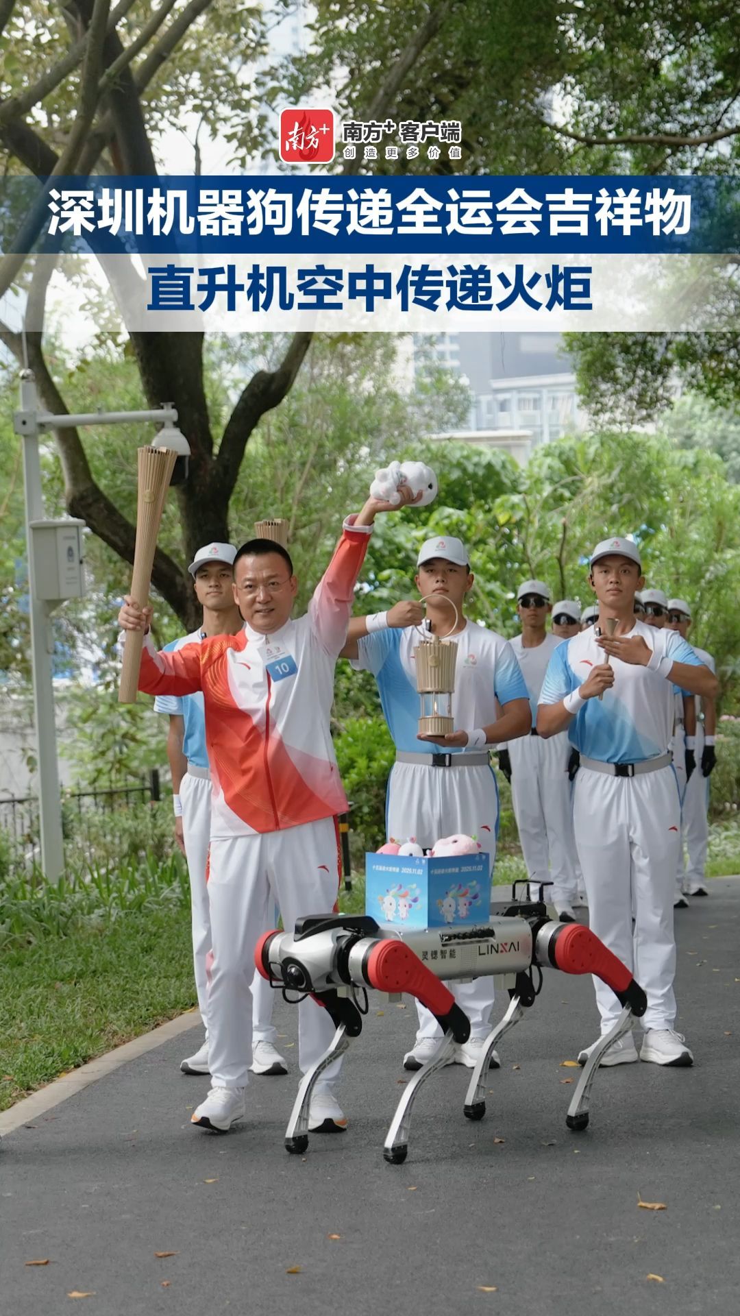 深圳机器狗传递全运会吉祥物,直升机空中传递火炬