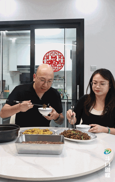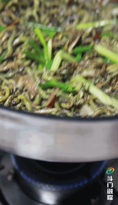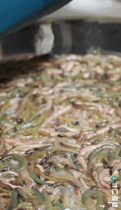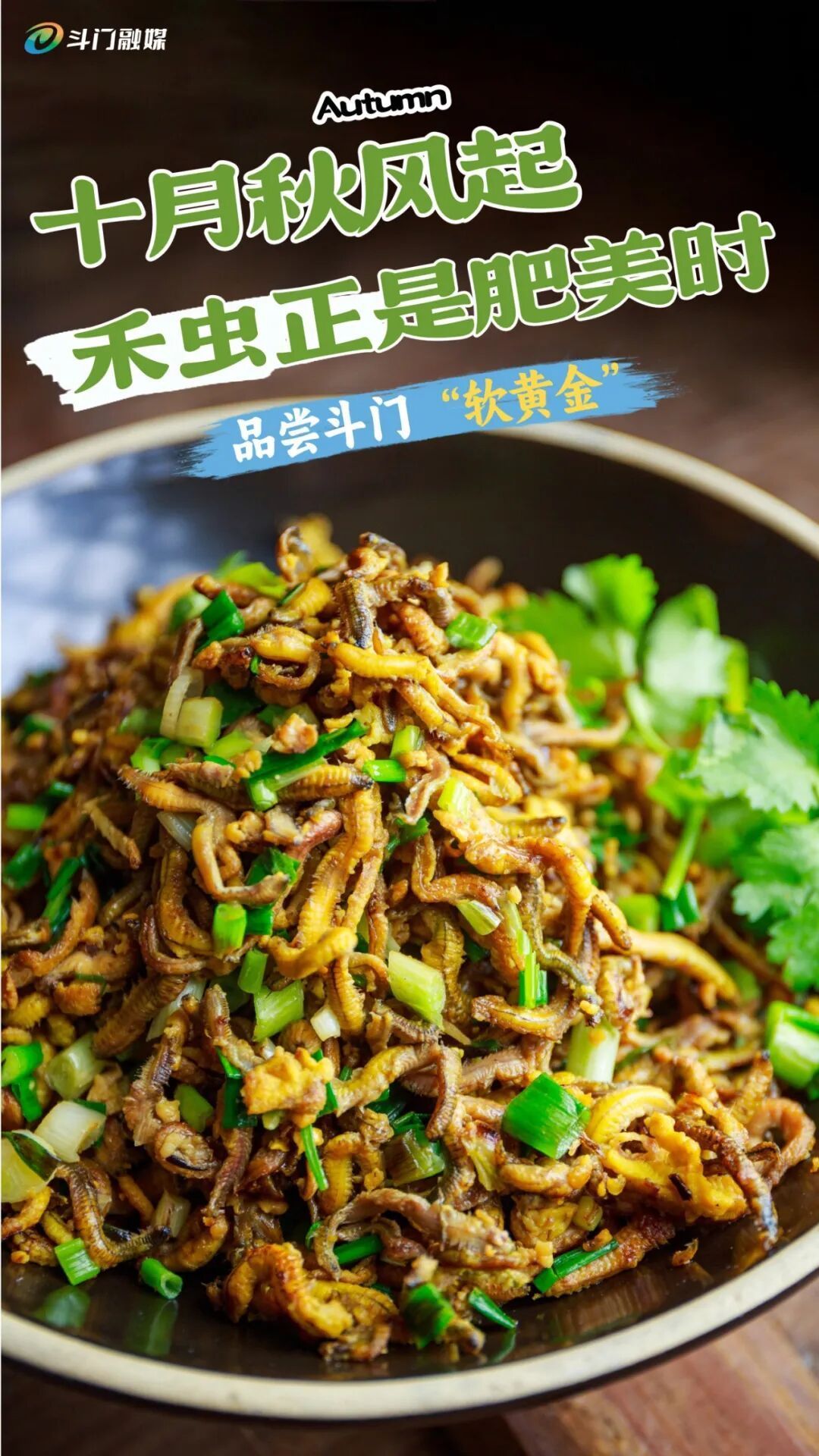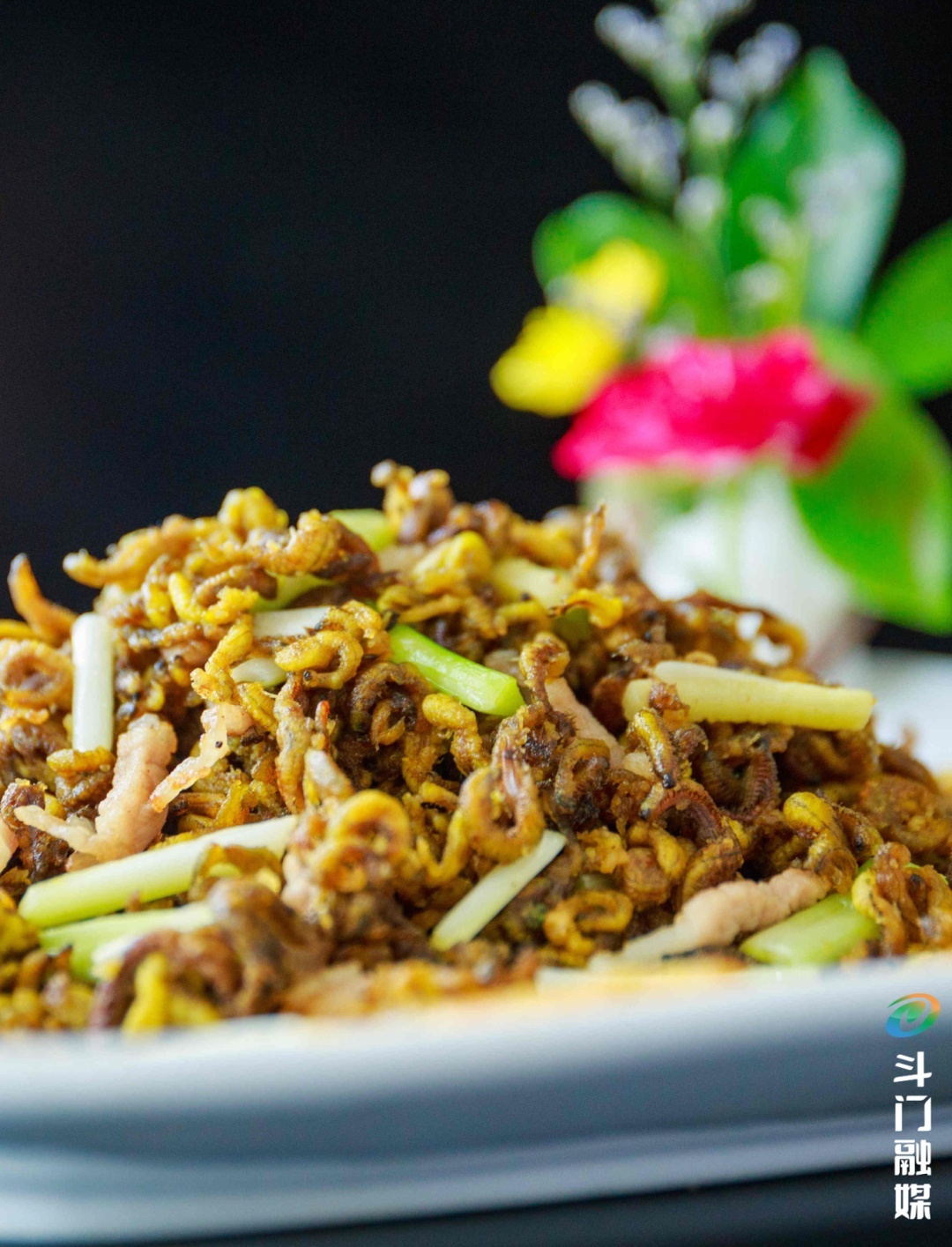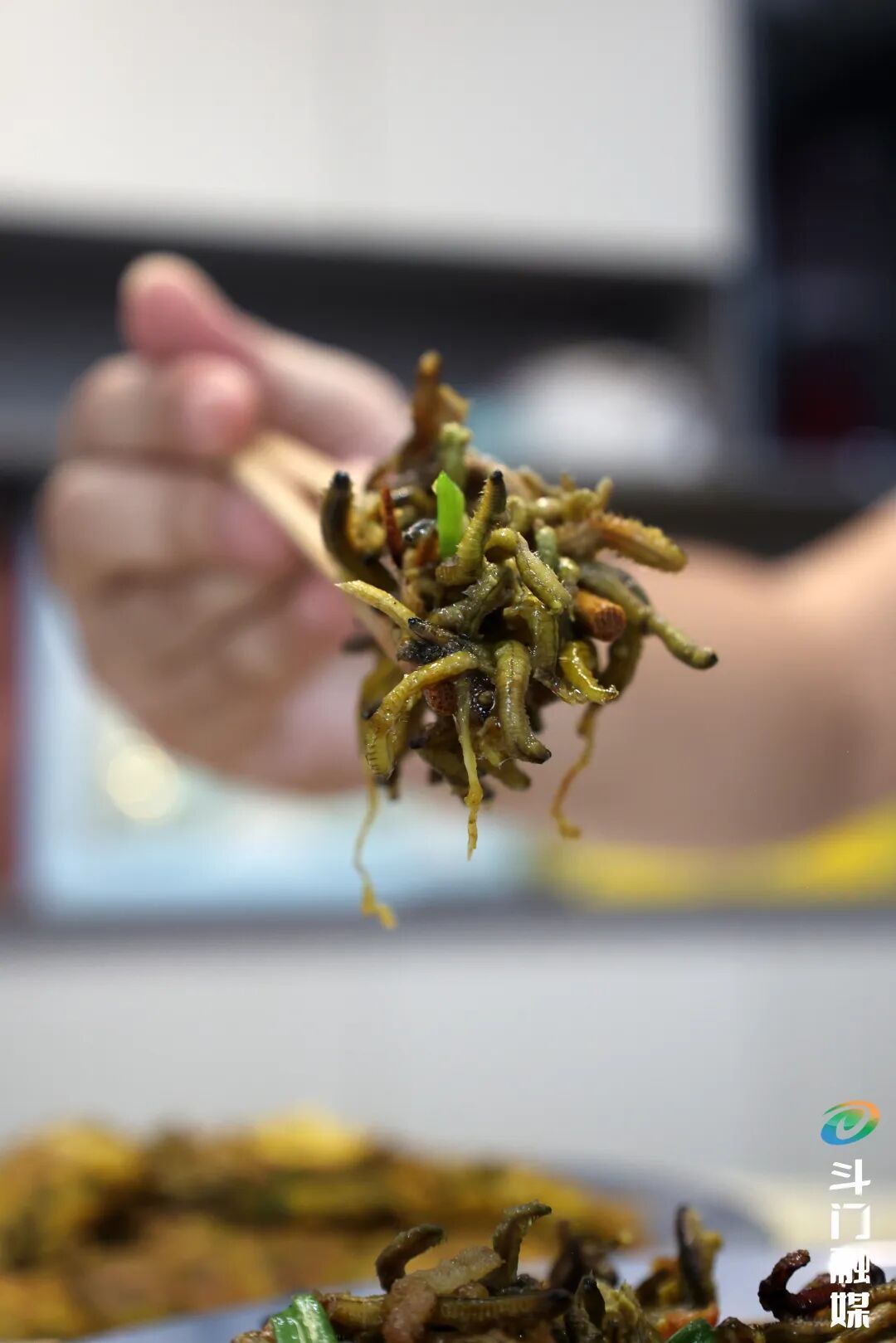 炒禾虫最考验功夫。小斗先小火爆香肥猪肉丝,随即放入禾虫慢炒至虫身金黄,再加入陈皮、葱、姜、酱油等配料继续翻炒。出锅时,禾虫油光锃亮,裹着酱汁,咸鲜中带着焦香。