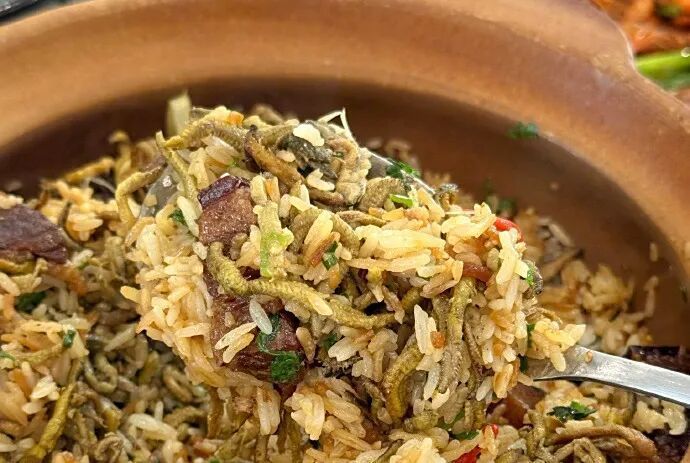 把禾虫融入米饭,斗门特色禾虫煲仔饭、禾虫腊味饭,开盖就是腊香、虫香、米香“三香合一”,锅巴金黄酥脆。