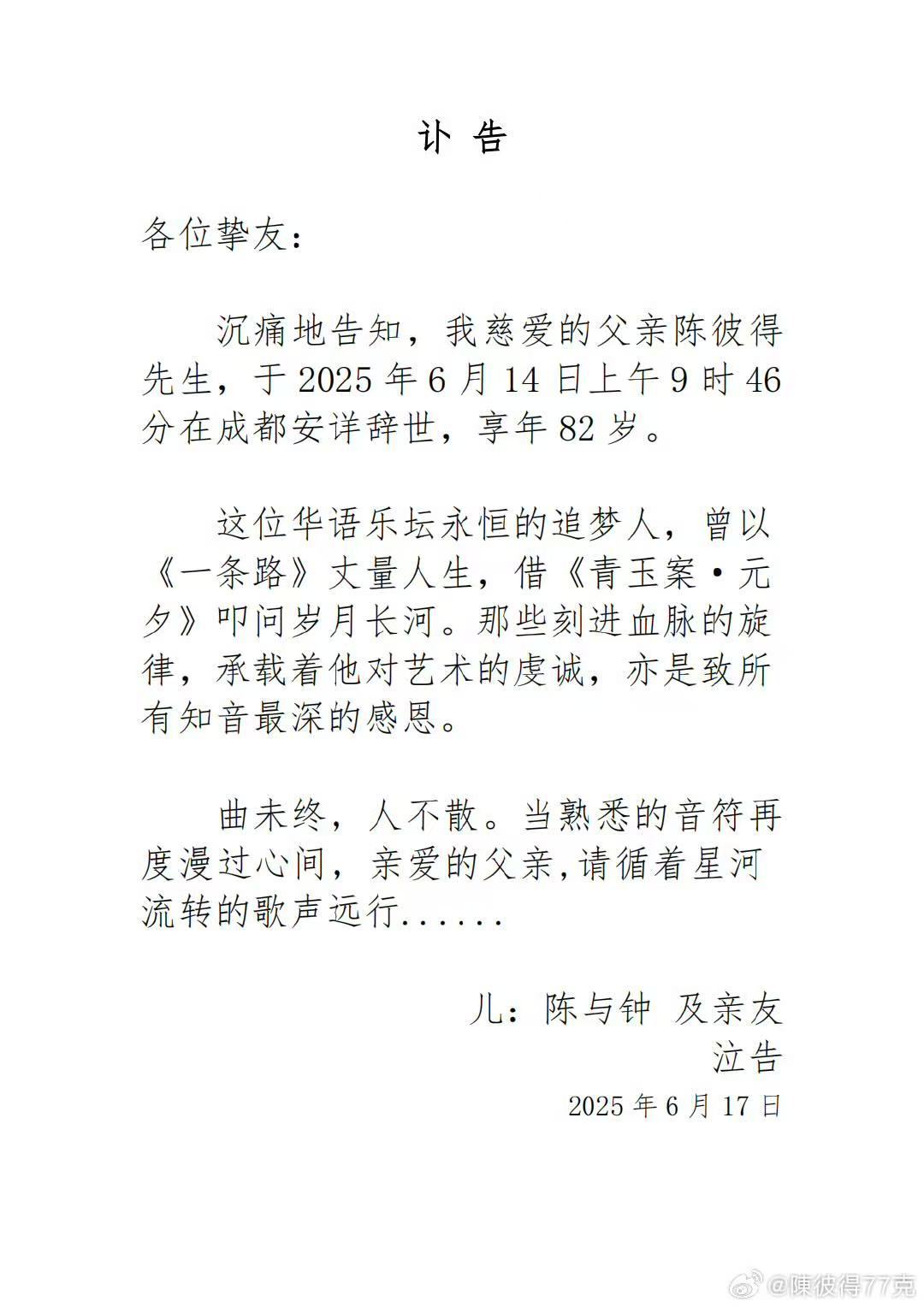 6月17日,陈彼得亲友通过社交账号发布中国著名音乐人陈彼得逝世的消息。讣告中提到,陈彼得先生于2025年6月14日上午9时46分在成都安详辞世,享年82岁。