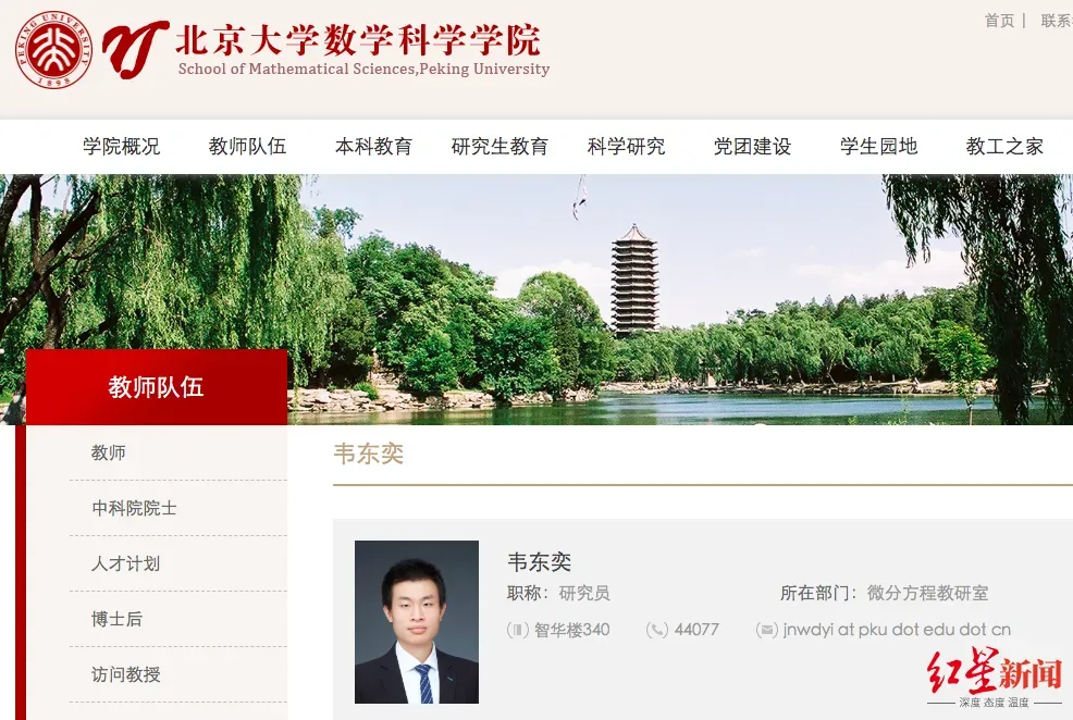 另据此前报道,北京大学数学科学学院官网显示,韦东奕在微分方程教研室担任研究员。