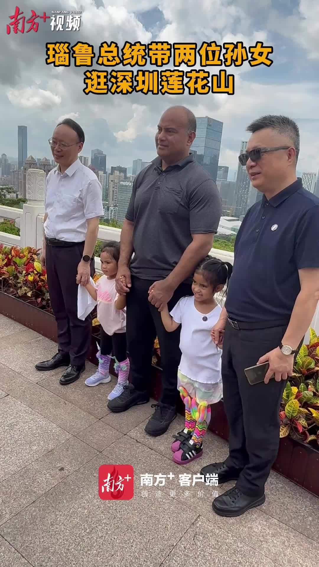 在山顶平台,阿迪昂总统牵着两位可爱的外孙女,一边聆听关于深圳改革开放的介绍,一边欣赏城市风光。工作人员向总统介绍了视野中的标志性建筑——深圳市民中心与深圳第一高楼平安金融中心,以及建筑造型蕴含的文化寓意。阿迪昂总统随后与两位外孙女以市民中心为背景合影留念。