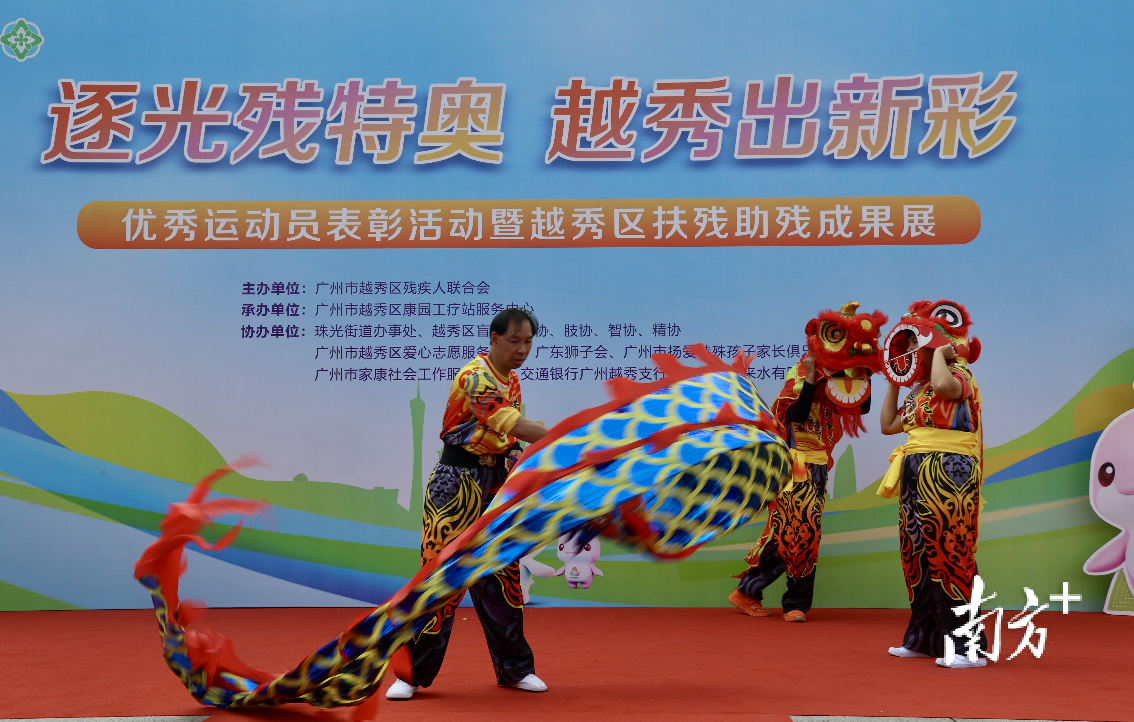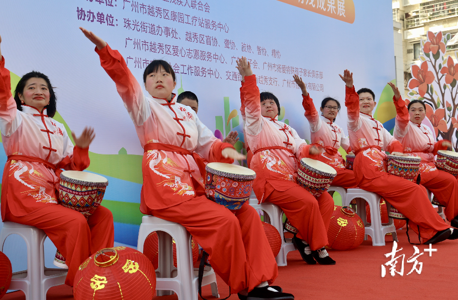 在团一大广场的红色氛围中,残疾人才艺展演精彩纷呈。区智力残疾人及亲友协会带来的《笑傲江湖之龙情狮意》气势昂扬,东山街康园工疗站的军体拳刚劲有力,区康园工疗示范站的弹唱和手语舞温情动人,北京街康园工疗站的非洲鼓伴着灯笼舞活力四射,广州市扬爱特殊孩子家长俱乐部的妈妈们旗袍表演则尽显优雅韵味。表演者与家属们以灵动鲜活的演绎,生动展现出“向阳而生、自立自强”的精神力量,赢得现场阵阵掌声。