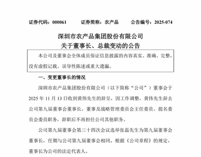 值得注意的是,黄伟目前仍担任农产品控股股东深圳农业与食品投资控股集团(简称 “深农投”)的董事长、党委书记,而深农投持有农产品 34% 的股份,实际控制人为深圳市国资委,此次黄伟卸任上市公司董事长,更多是出于国企内部工作调整安排,并未脱离其核心管理体系。