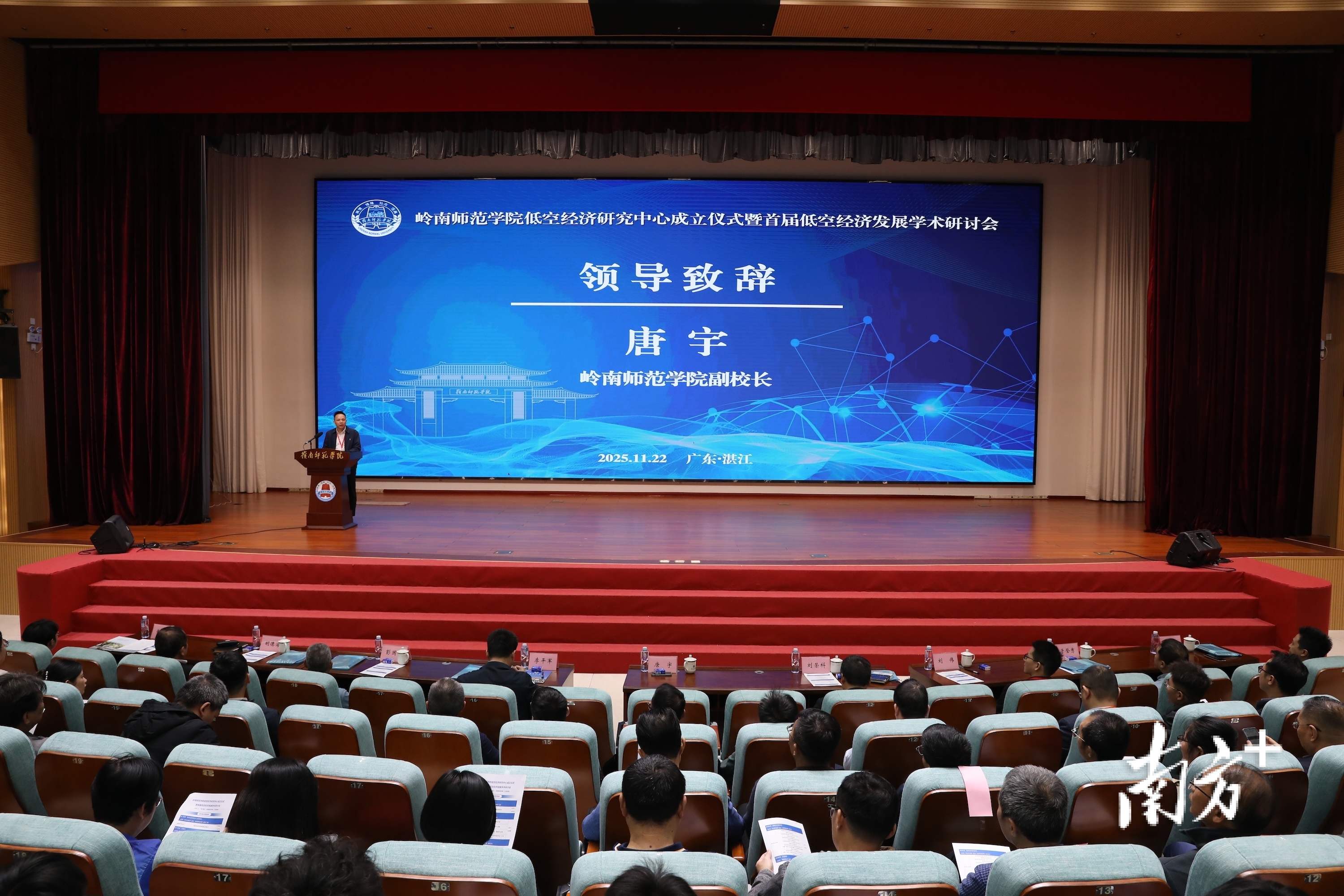 11月22日,岭南师范学院低空经济研究中心成立仪式暨首届低空经济发展学术研讨会在寸金校区举行。岭南师范学院党委常委、副校长唐宇,湛江市赤坎区委副书记、区人民政府党组书记、区长李平军,深圳市无人机行业协会副秘书长黄超勇出席开幕式并致辞。北京航空航天大学教授刘荣科,华南理工大学教授刘伟,西北工业大学教授于登秀、腾云航空科技(深圳)有限公司董事长刘俊辉莅校作论坛主旨报告。