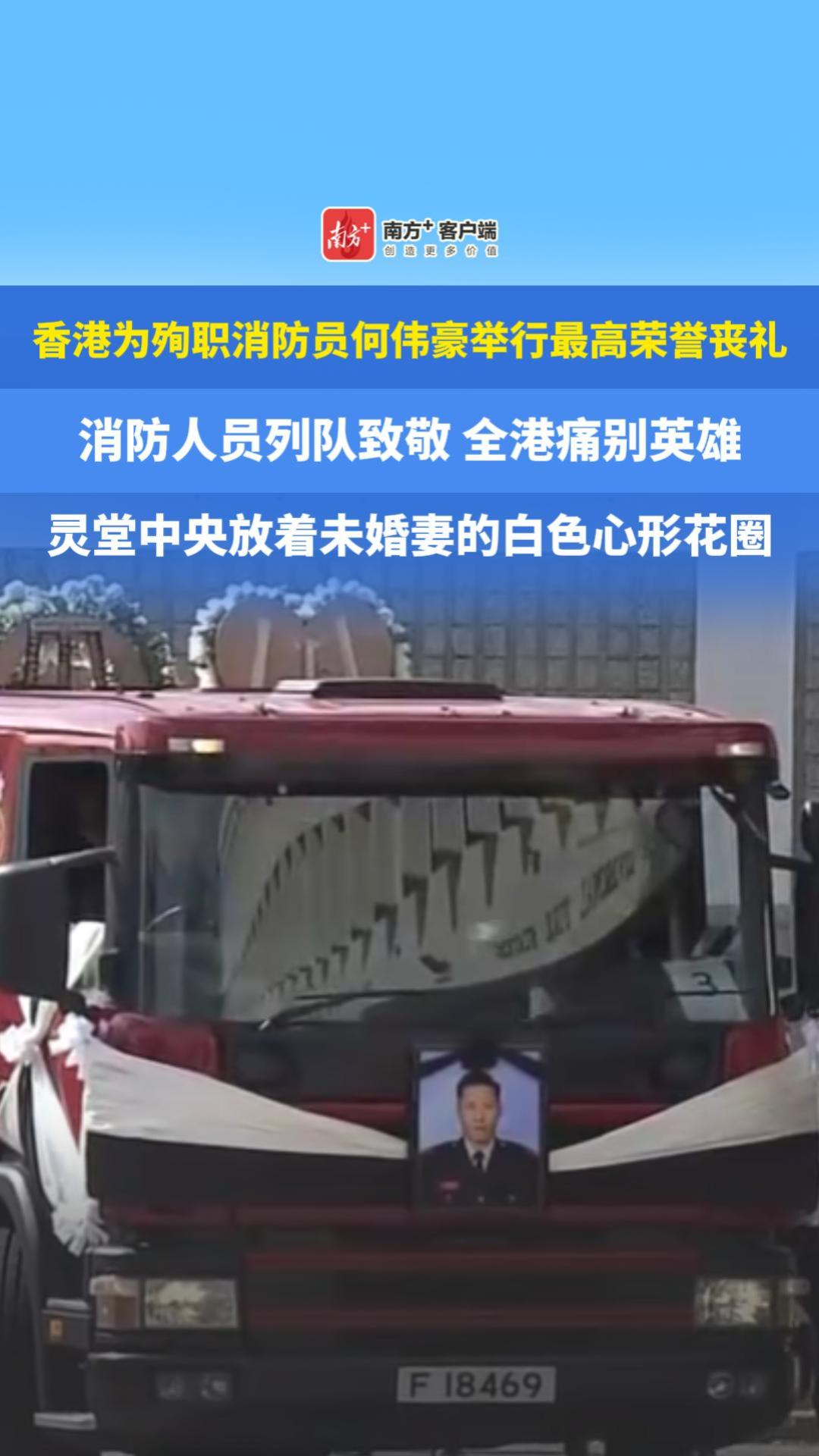 香港为殉职消防员何伟豪举行最高荣誉丧礼,灵堂中央放着未婚妻的白色心形花圈