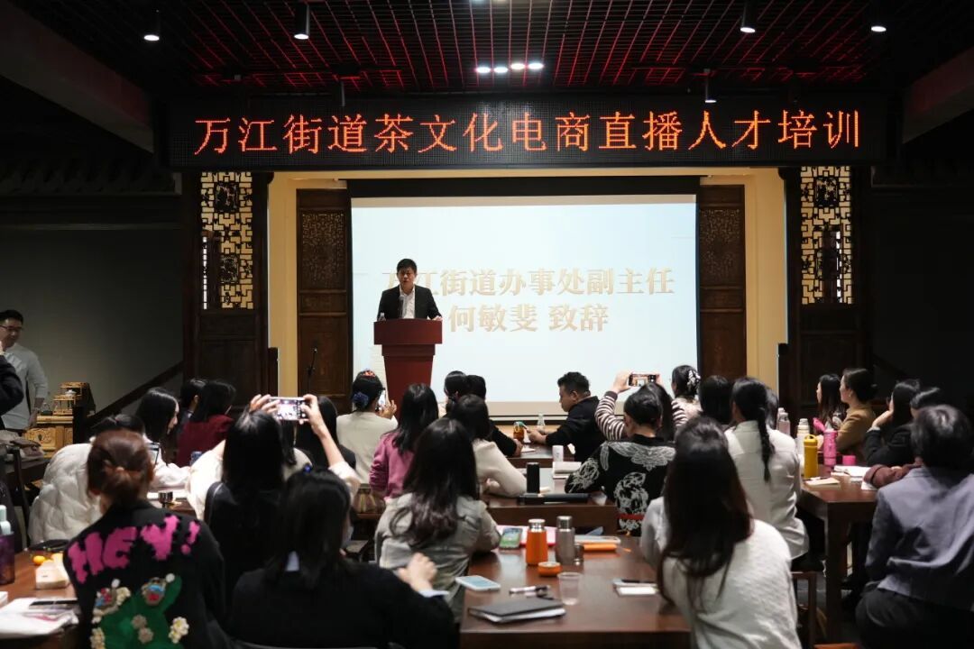 为推动茶产业线上线下融合发展,12月16日,万江街道举行茶文化电商直播人才培训开班仪式。万江街道办事处副主任何敏斐出席开班仪式。