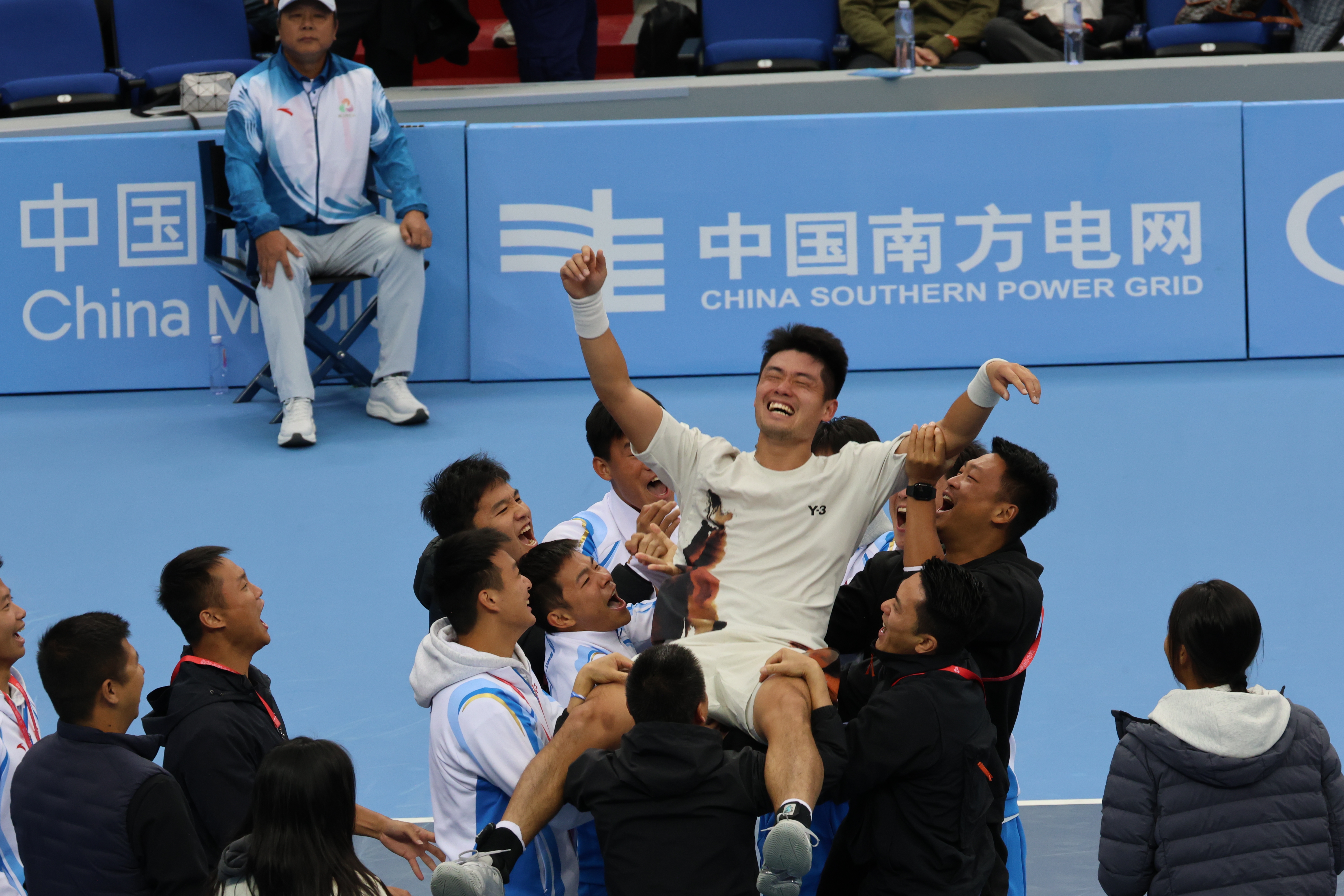 11月20日,在珠海横琴国际网球中心,十五运会男子网球单打项目决赛现场,全场观众屏息凝神。吴易昺一记ACE球(发球直接得分)干脆利落地砸在界内,锁定胜局。决赛比分定格在6-0、1-6、6-4。