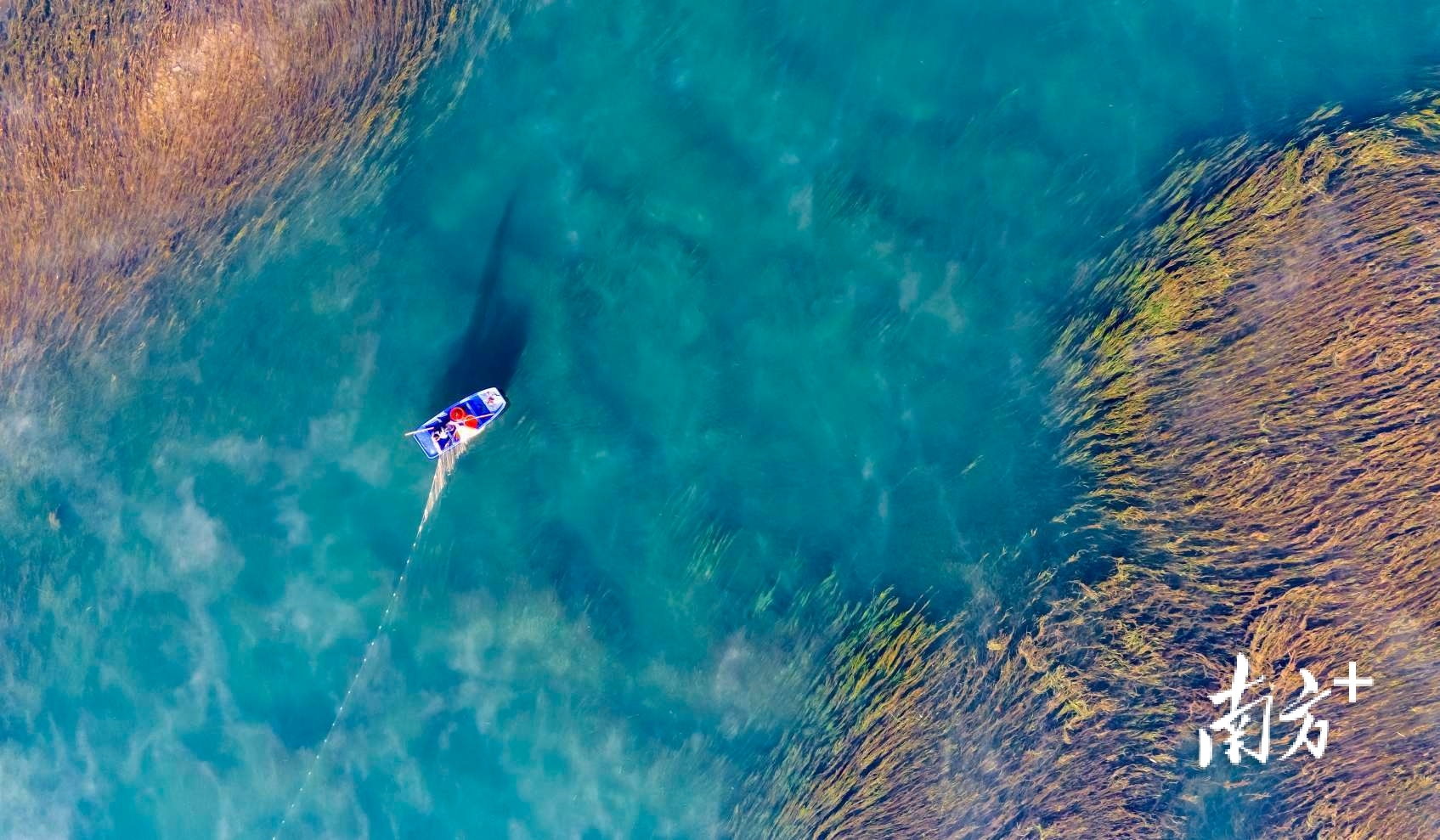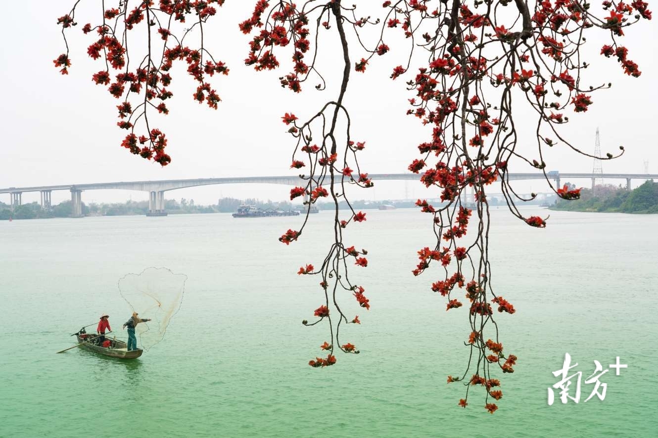 3月18日,江门大鳌镇红卫村,300年古木棉下,渔舟上渔民撒网捕鱼。南方+拍客 李程 摄