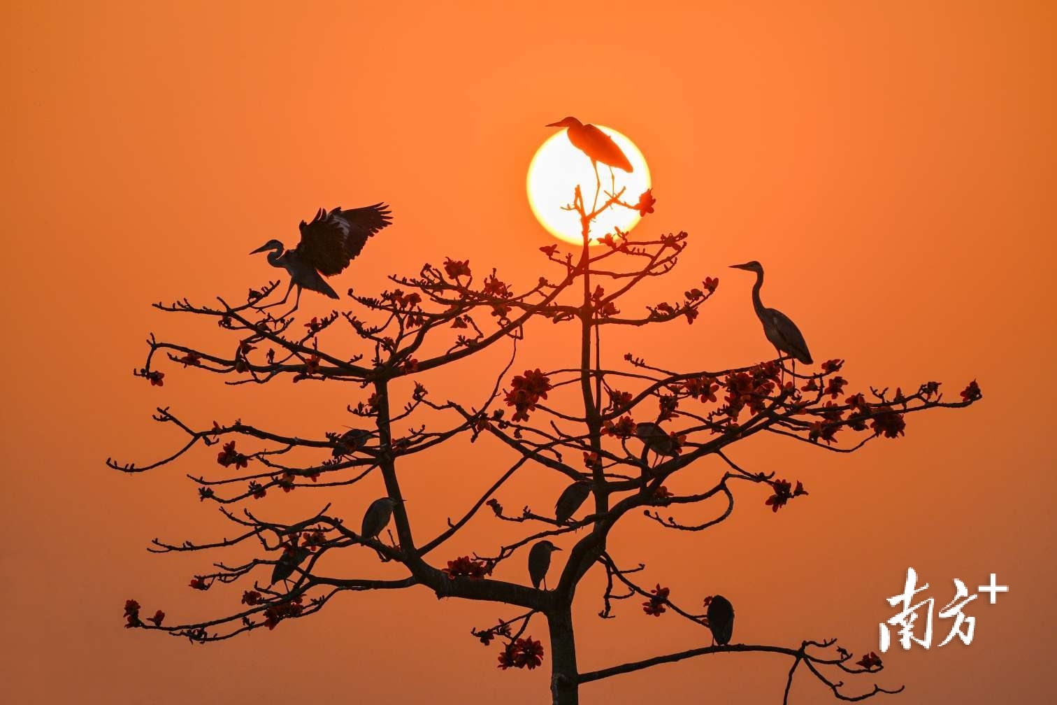 3月20日日落时分,珠海三板村白鹭归巢,红棉树成了它们的栖息处。南方+拍客 郑志刚 摄