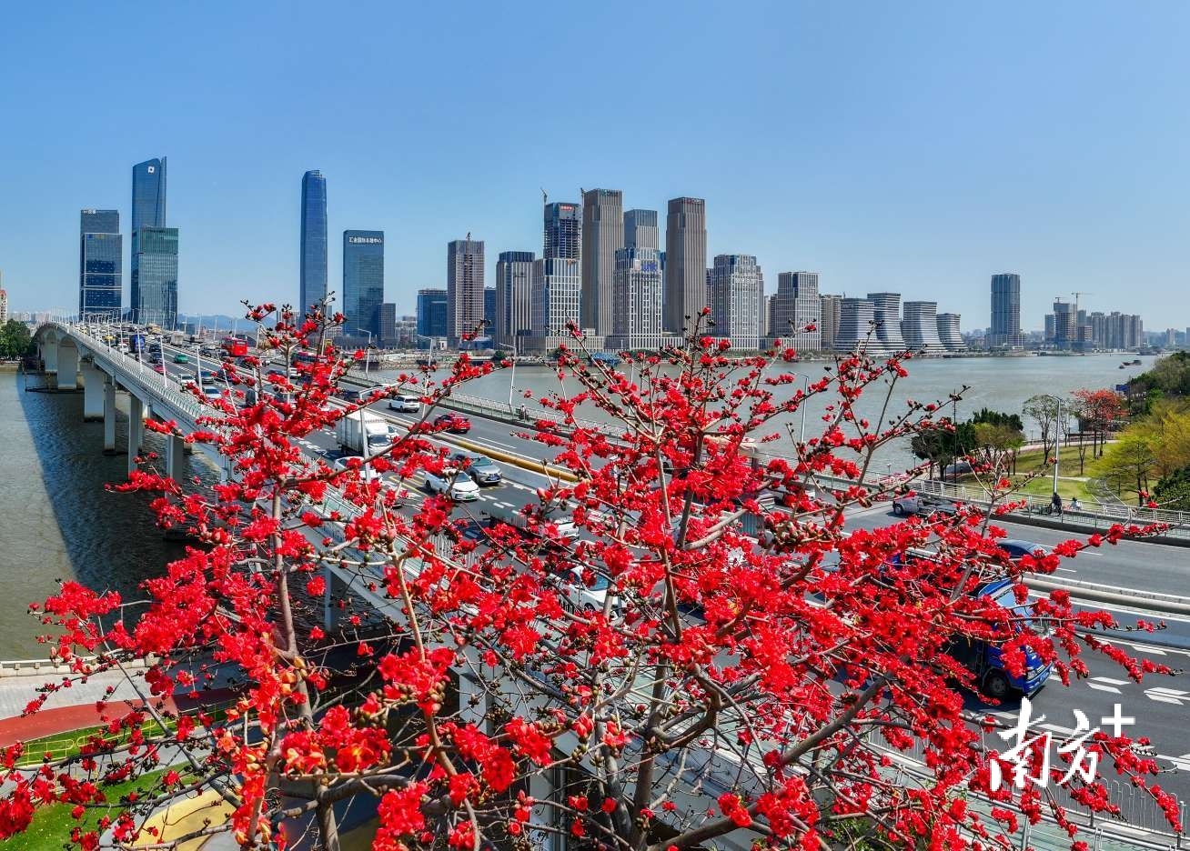 3月18日,广州琶洲大桥下,红棉绽放,成为街头一道亮丽风景。南方+拍客 王美燕 摄
