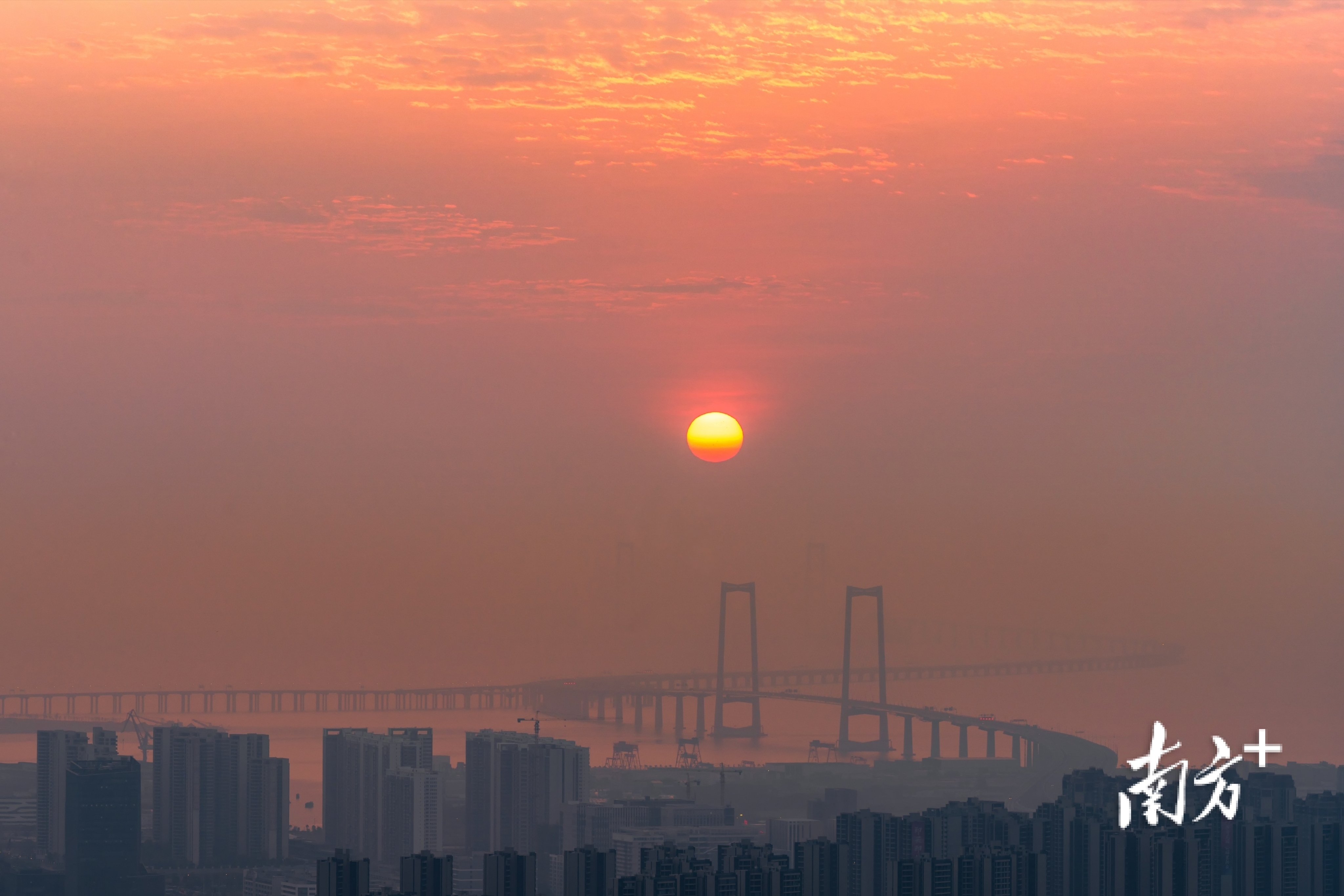 当太阳从宏伟的深中通道后方缓缓升起,超级工程与日出美景交相辉映。南方+拍客 欧阳龙 摄