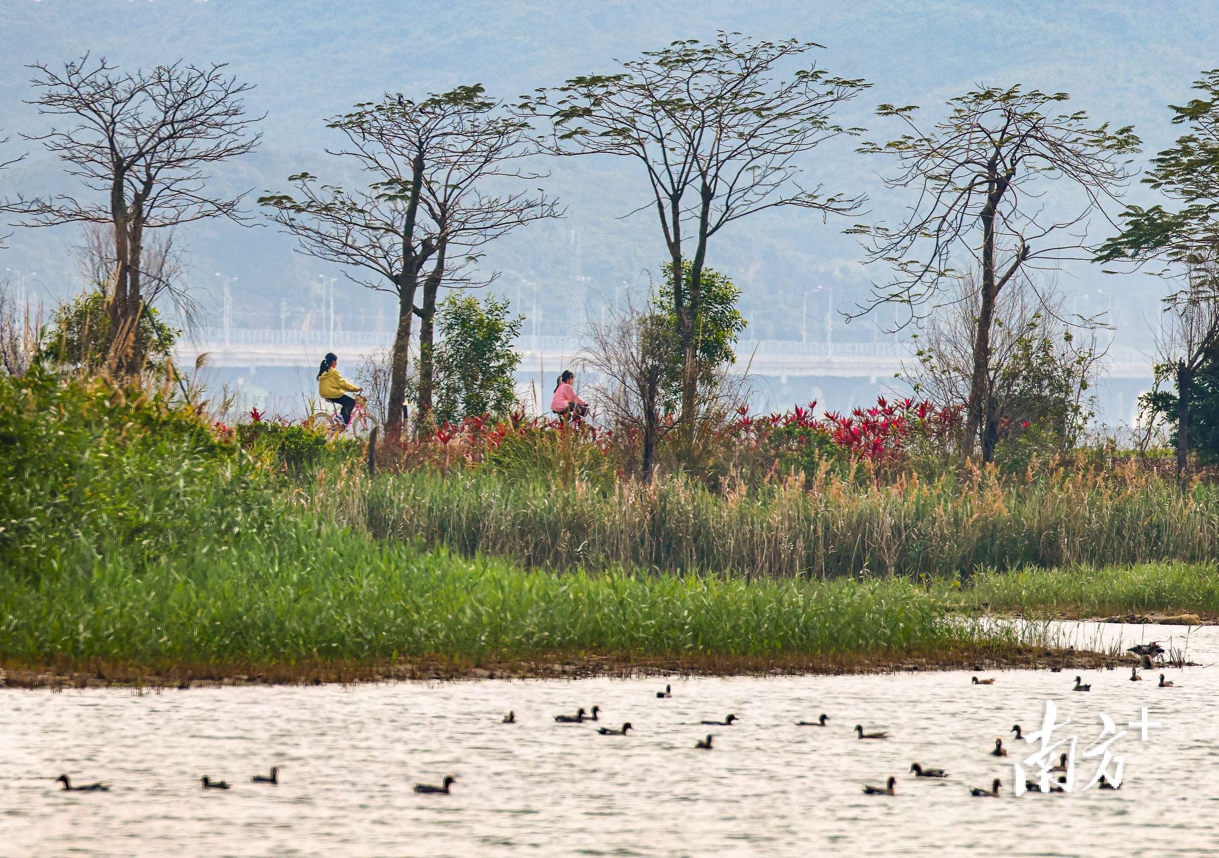 3月19日,珠海横琴二井湾湿地公园,游客骑车游玩。