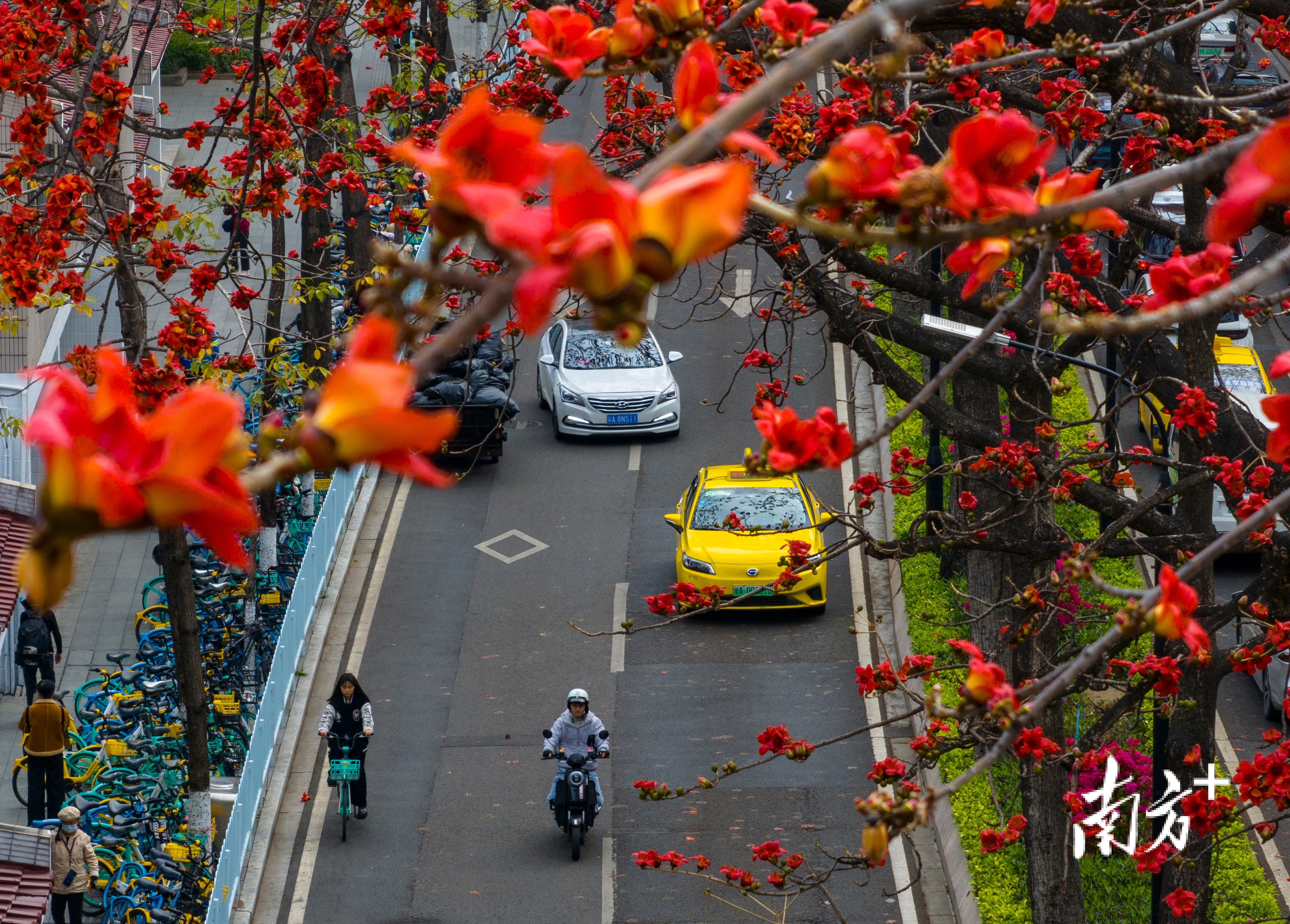 3月18日,广州陵园西路木棉花开,火红的木棉树下,行人、车辆穿梭而过。南方+拍客 谷小红 摄