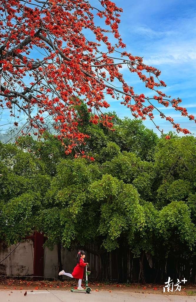 近日,广州番禺区石楼镇亚运城沥江边,一棵百年木棉绽放,小朋友在木棉树下玩耍。南方+拍客 解卫潮 摄