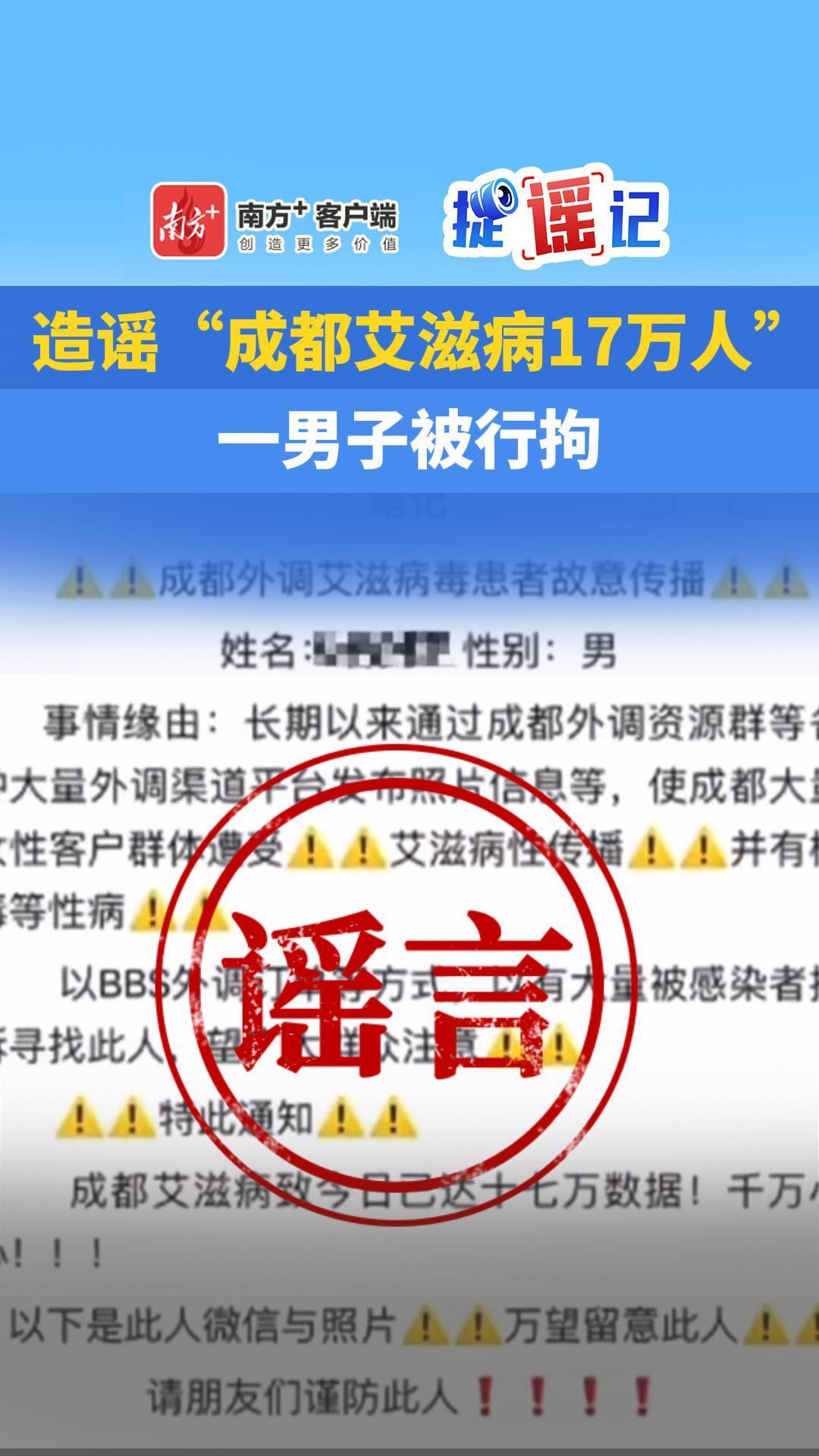 日前,成都发布通报称,一男子在某短视频平台发布信息称“成都艾滋病已达十七万”引发广泛关注,导致部分网民产生恐慌情绪。目前,警方已依法对该男子处以行政拘留5日。详情>>
