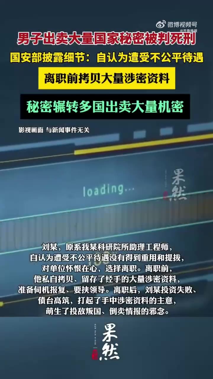 近期,国家安全机关破获一起我某科研单位工作人员私自拷贝、复制并向境外间谍情报机关出卖大量国家秘密的间谍案件。原某科研院所助理工程师刘某,因犯间谍罪、非法提供国家秘密罪被依法判处死刑,剥夺政治权利终身。详情>>
