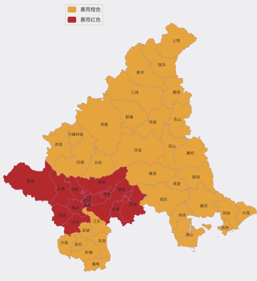 潮州市气象台于今天14时35分将湘桥区各街镇,潮安区古巷镇、登塘镇、凤塘镇、浮洋镇、枫溪镇暴雨橙色预警信号升级为红色,潮安区龙湖镇、金石镇、沙溪镇、彩塘镇、东凤镇、庵埠镇、江东镇、归湖镇、文祠镇、凤凰镇、赤凤镇、万峰林场暴雨橙色预警信号继续生效。