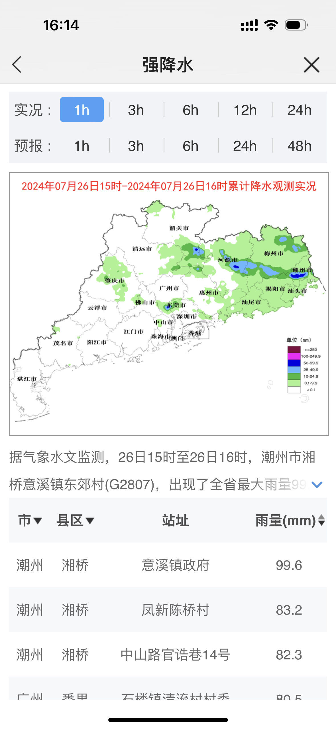 据气象水文监测,26日15时至16时,潮州市湘桥区意溪镇东郊村出现了全省最大雨量99.6毫米,全省平均雨量1.9毫米。