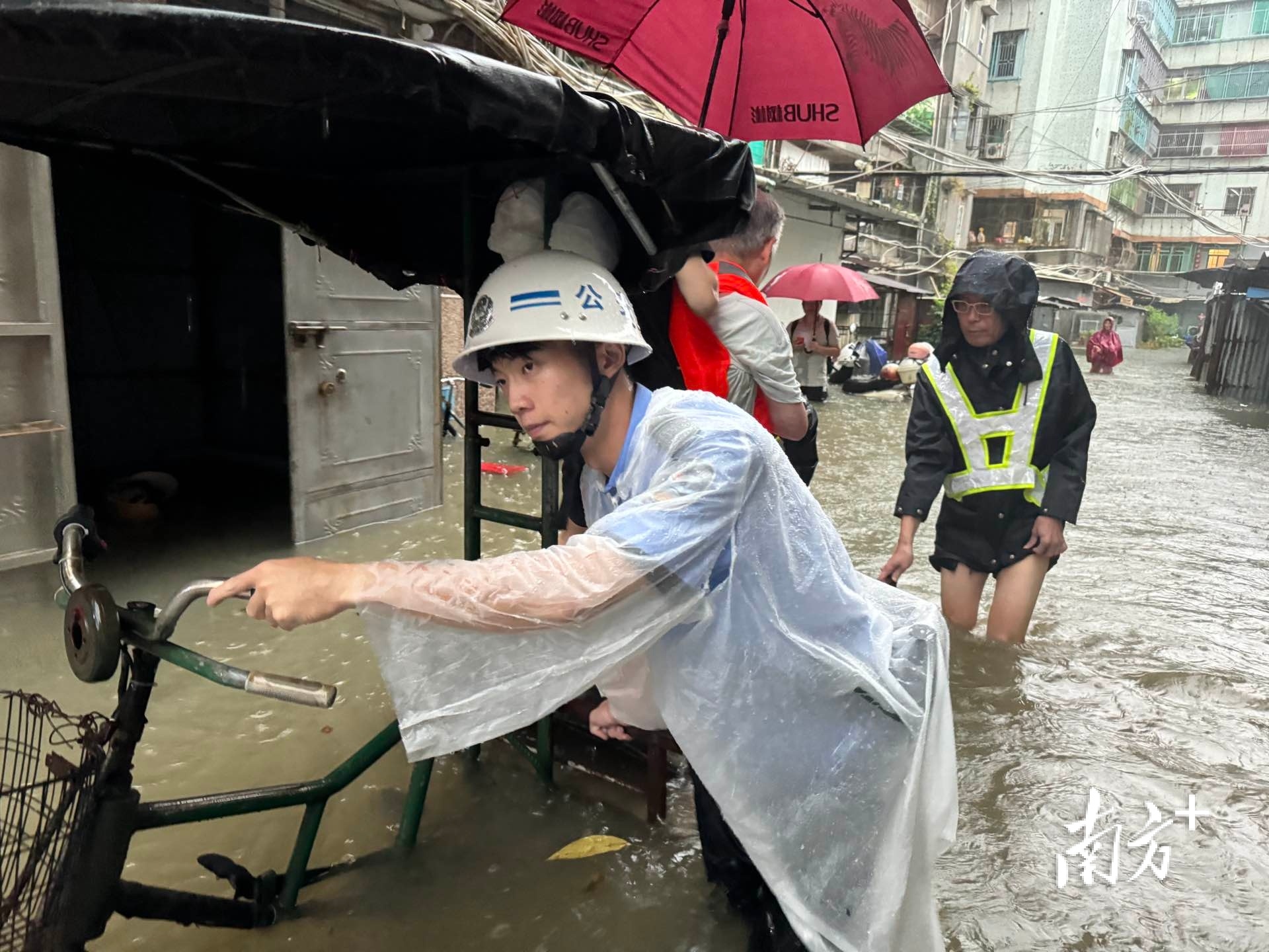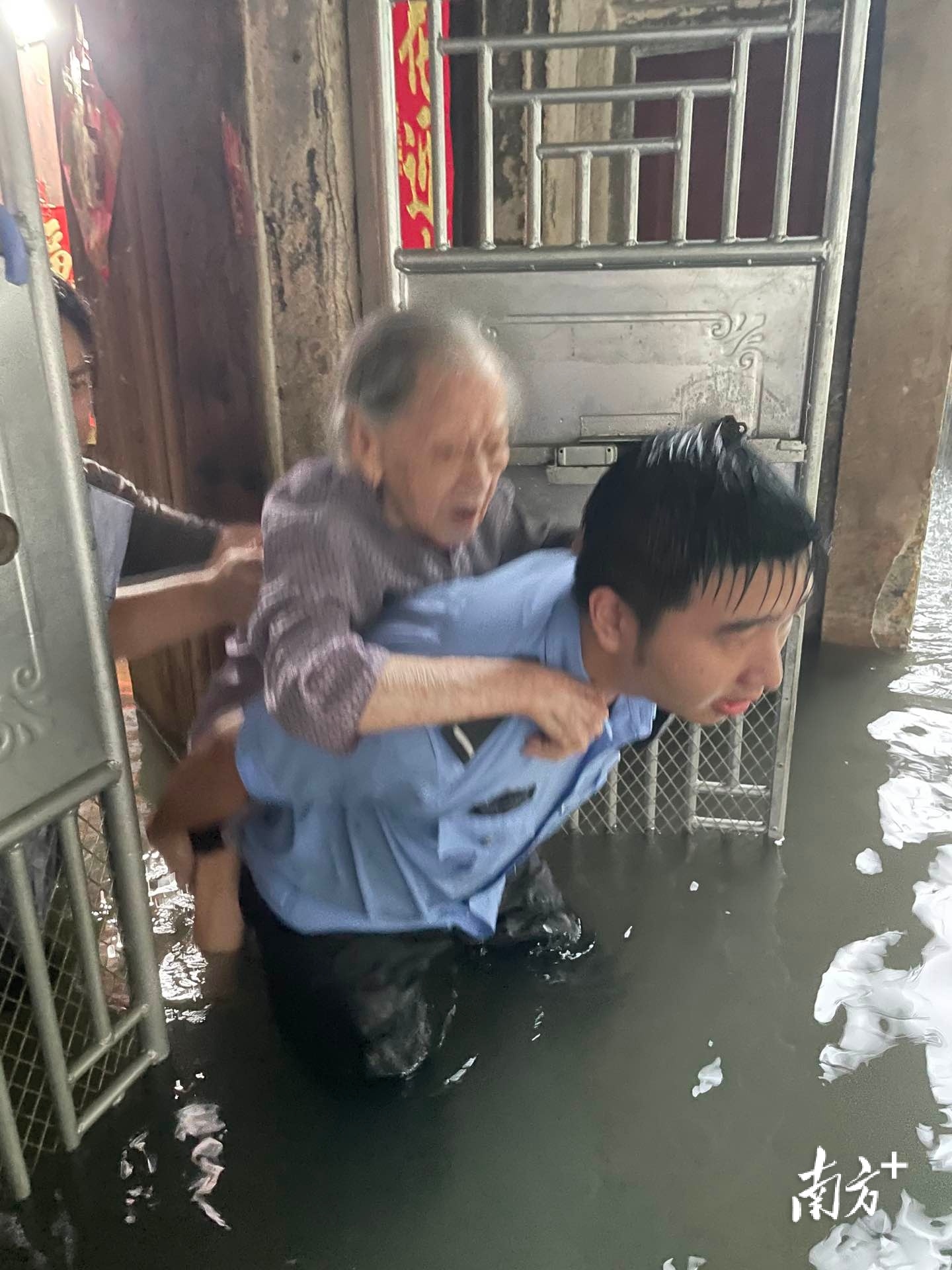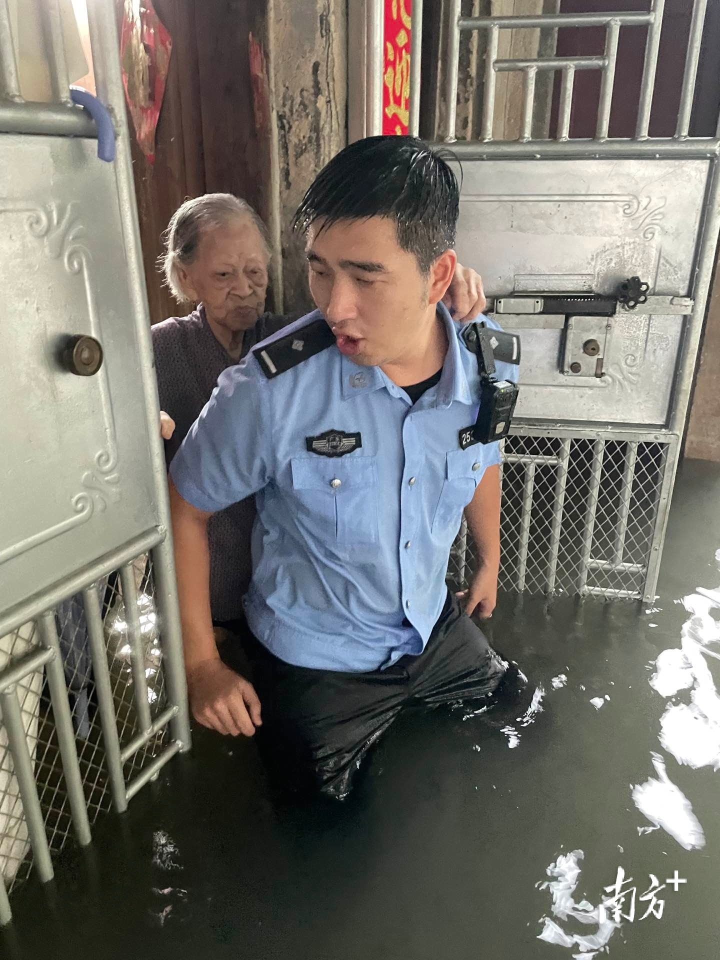 受台风“格美”影响,7月26日潮州市迎来持续降水。26日15时许,湘桥分局西新派出所接群众求助称振德街一老人因积水过深被困屋内,接到求助后值班民警立即赶往现场紧急救援。此时,雨下得正急,行驶非常艰难,车辆无法通行,民警潘涵下车冒雨蹚水一步步靠近报警地点。到达现场后,民警发现一排平房,周围已被水淹没至大腿处,水位深约70公分。冒着大雨,蹚过深水,民警快速到达被困老人家中,确认屋内受困老人状态后将受困老人背出,转移至安全区域。