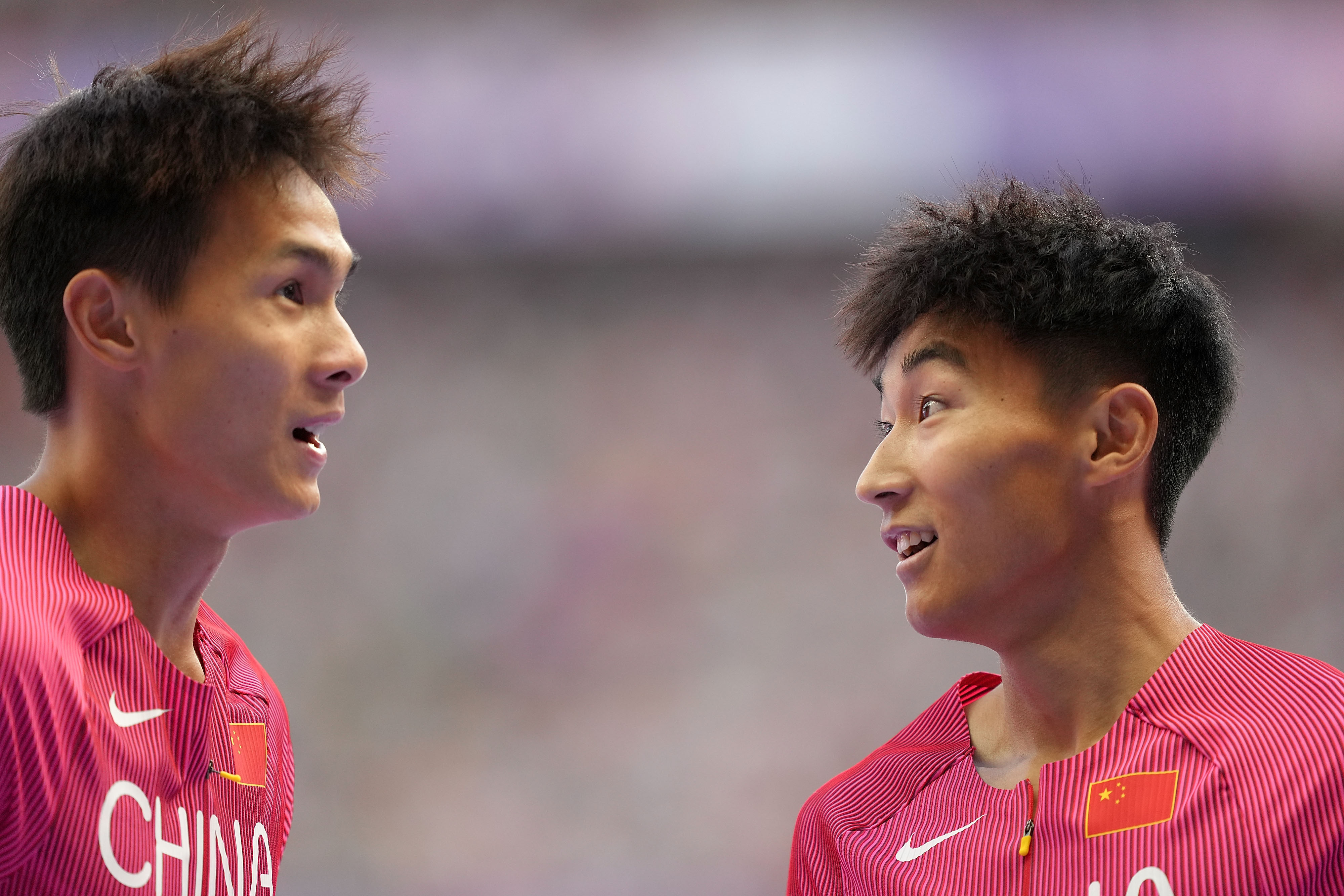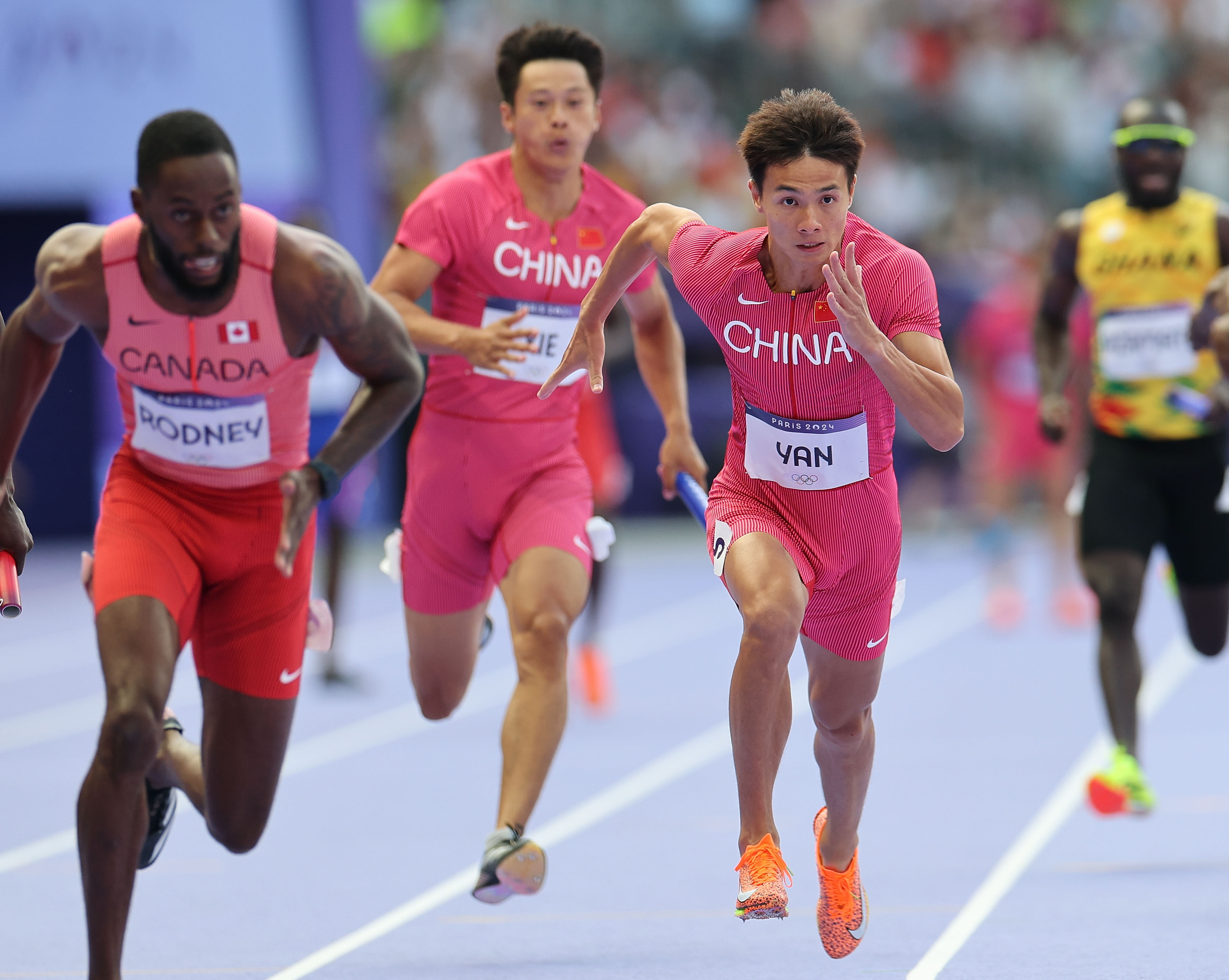 8月8日,中国队选手严海滨(前右)和谢震业(前中)在比赛中。当日,巴黎奥运会田径男子4X100米接力第一轮比赛在法兰西体育场举行。新华社发