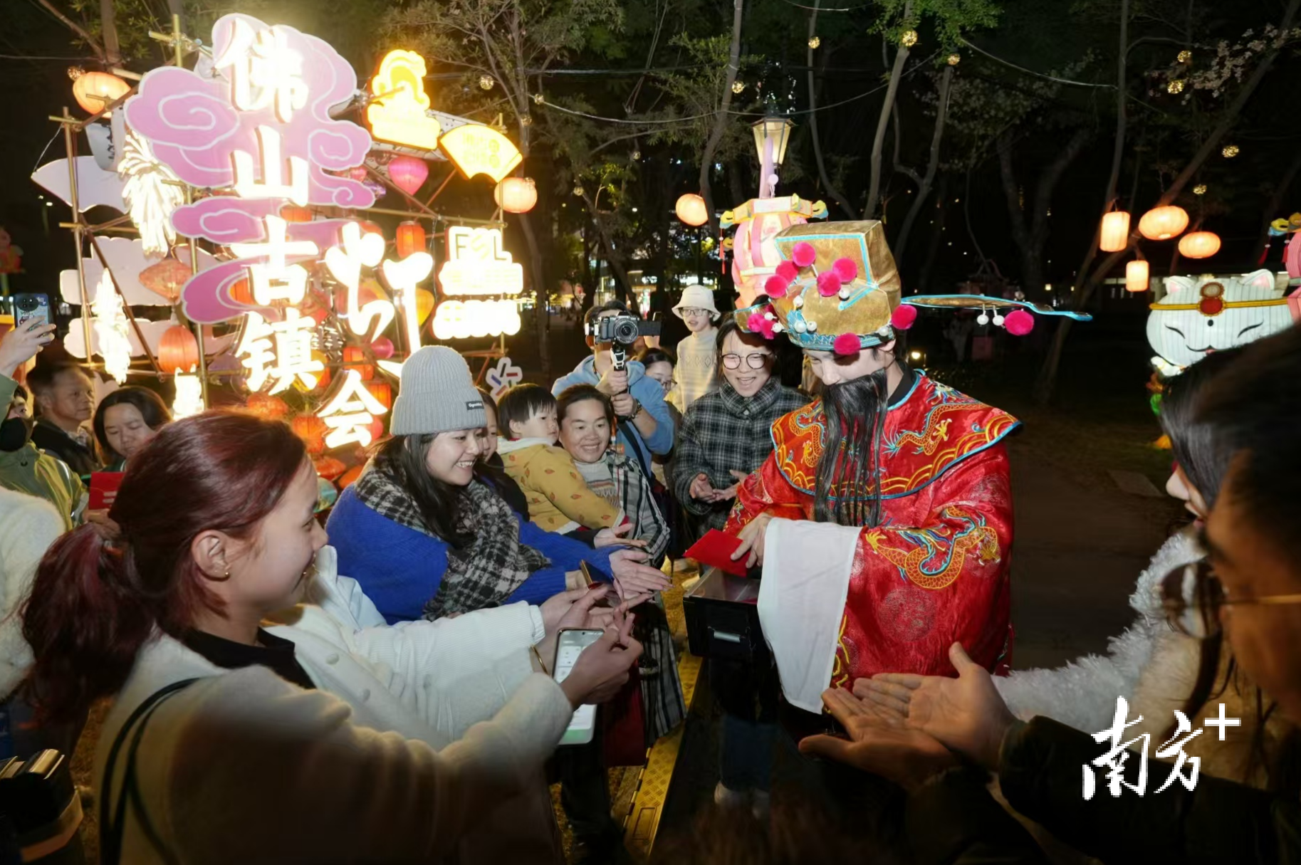 在木版年画摊位前,跟随非遗传承人请一幅新年的美好祝福;在剪纸摊位,剪下大红的吉祥图案;在挥春摊位前,自己挥墨写下祝福寄语;在文创摊位选购新春文创系列产品……古镇灯会还设有年味市集和非遗文化摊位,为市民朋友带来佛山特色的年味体验和新春祝福。此外,灯会现场还生动重现了佛山民俗“行通济”“塔坡庙会”等,现场实景搭建的通济桥和塔坡井,吸引市民群众纷纷打卡拍照。