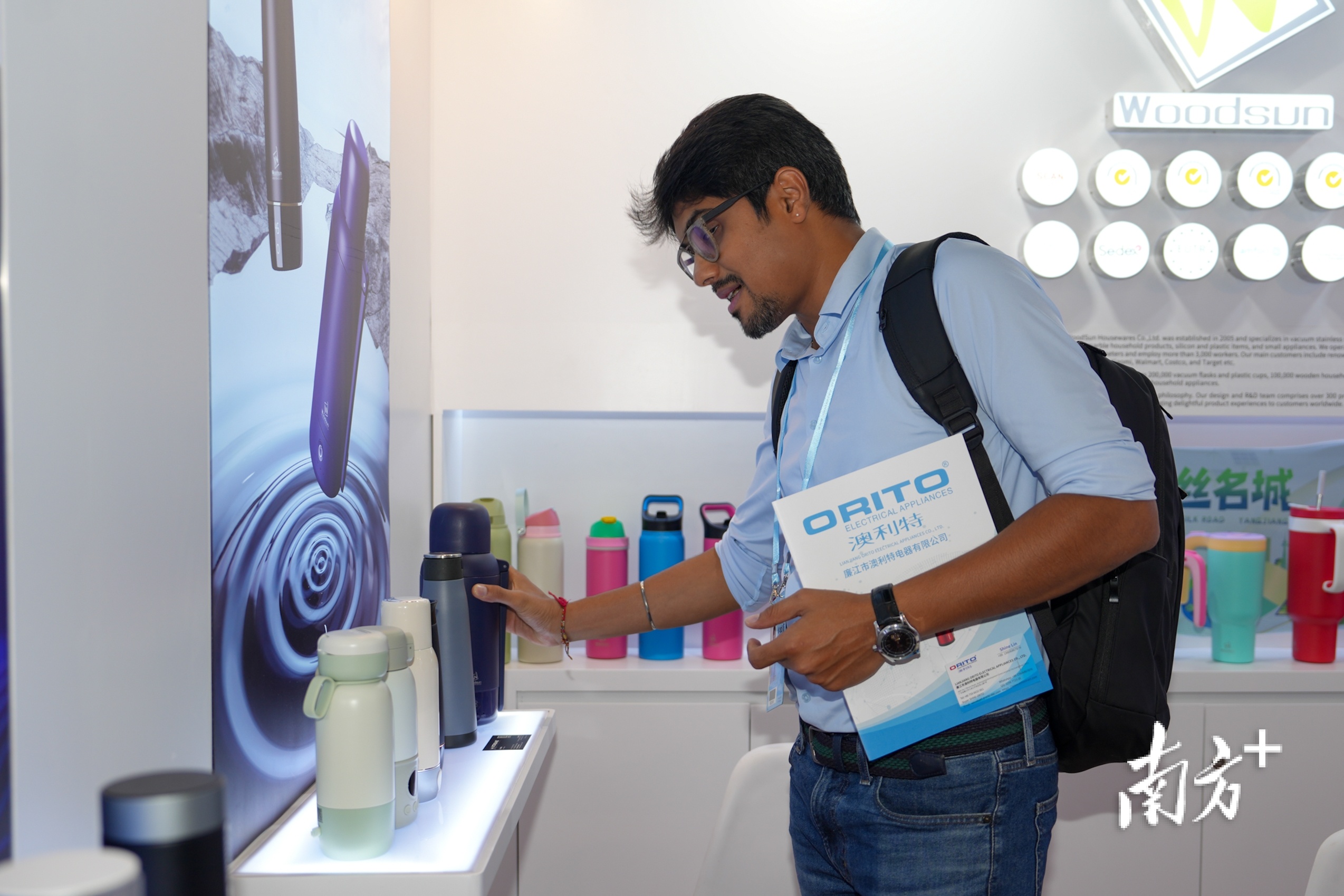 广东企业木森日用品公司的展位上,采购商拿起产品仔细查看。