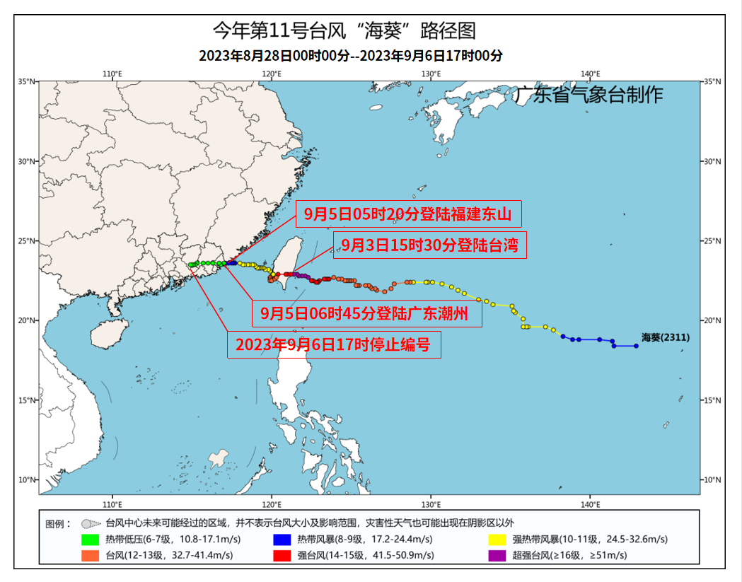 9月3日15时30分前后,“海葵”以强台风级(15级)登陆台湾,9月5日05时20分前后以热带风暴级(8级)登陆福建东山,06时45分在广东潮州再次登陆,登陆后逐渐减弱并往偏西方向移动。