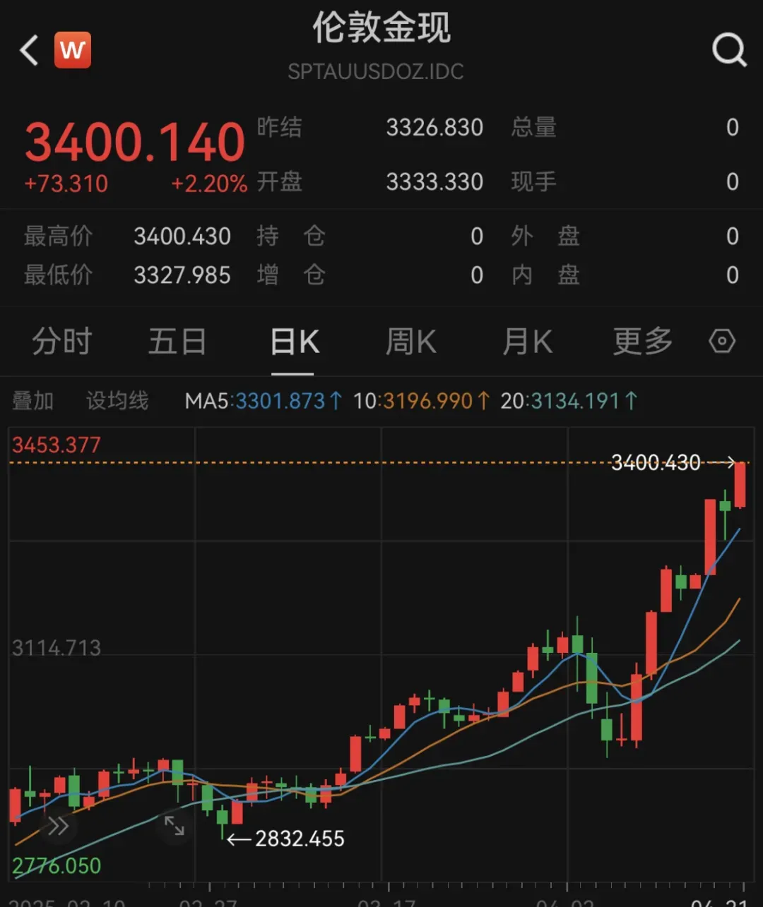 Wind数据显示,21日晚间,现货黄金突破3400美元/盎司,再创历史新高,日内涨约2.2%,较4月7日的2982.975美元上涨约14%。与此同时,COMEX黄金也持续创新高,盘中最高达到3409.3美元,日内涨约2.3%。