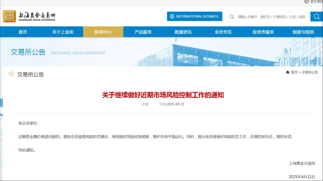 此外,上海黄金交易所21日发布《关于继续做好近期市场风险控制工作的通知》:近期贵金属价格波动剧烈。请各会员提高风险防范意识,继续做好风险应急预案,维护市场平稳运行。同时,提示投资者做好风险防范工作,合理控制仓位,理性投资。