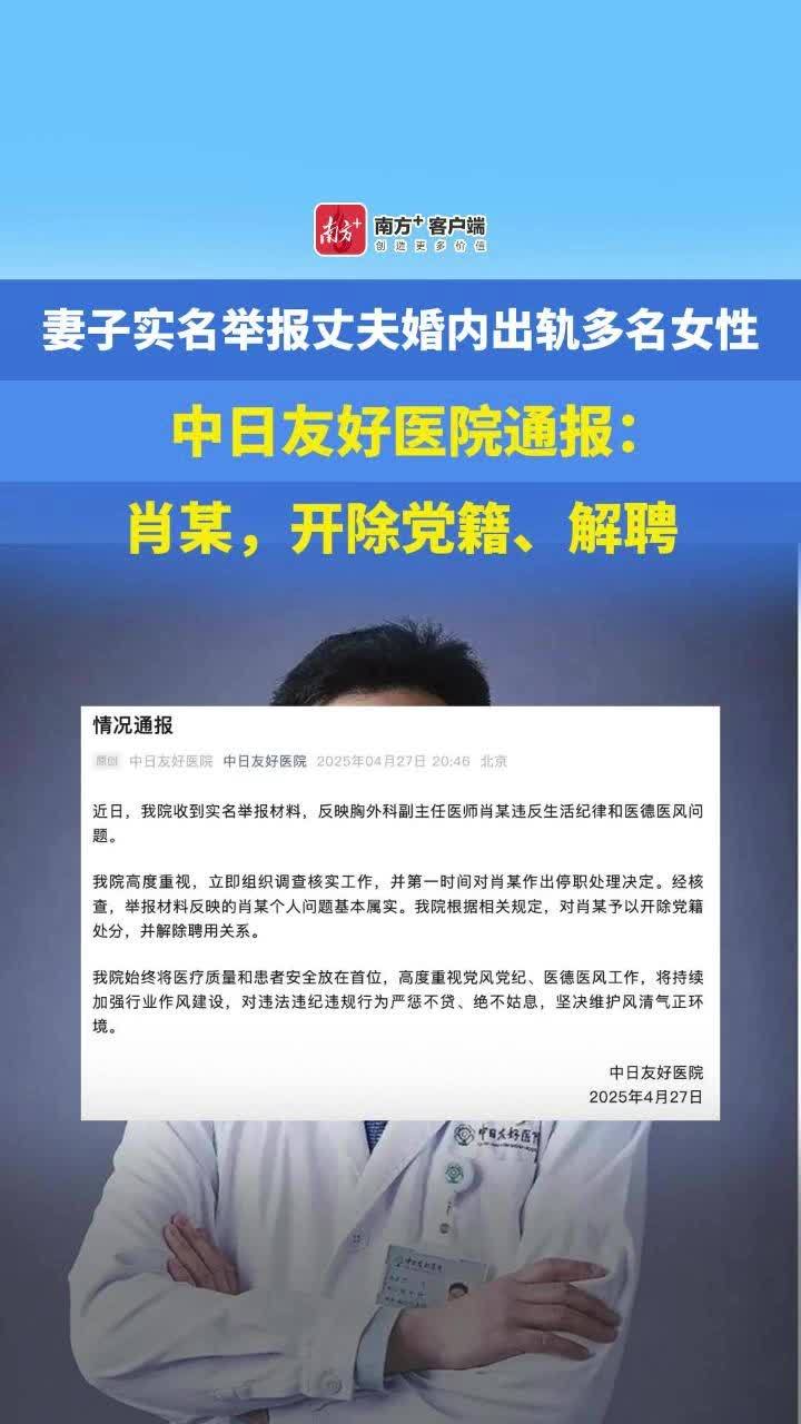 妻子实名举报丈夫婚内出轨多名女性,中日友好医院通报:肖某,开除党籍、解聘