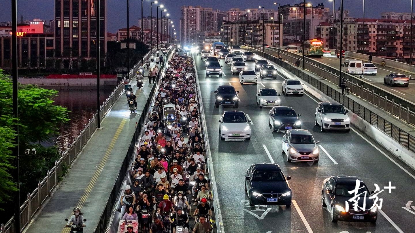 广州金沙洲大桥,非机动车道在下班高峰时段堵车。南方+记者 郑新洽 摄