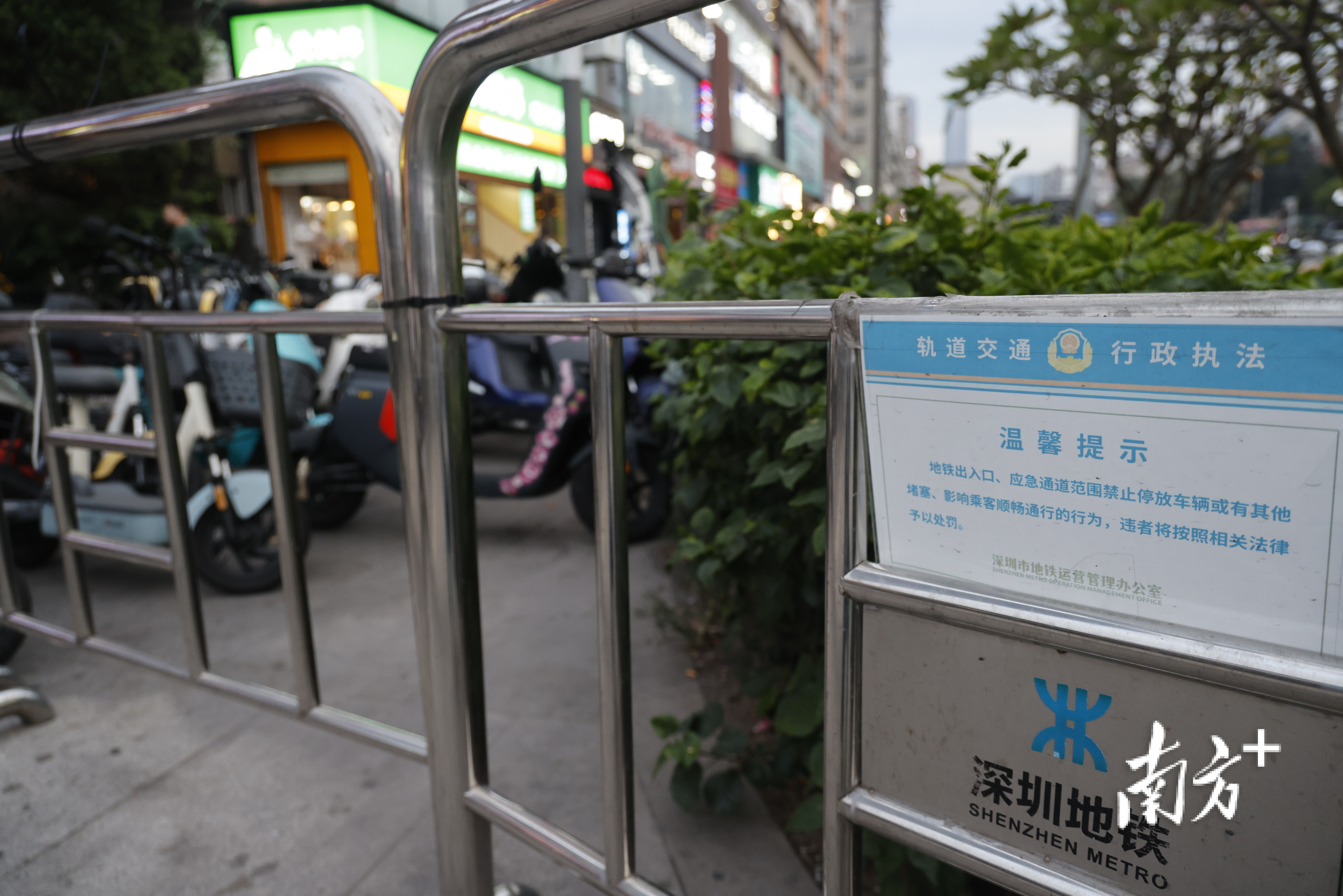 深圳坂田街道也关注到地铁口的问题。还没到下班时间,笔者就看到五六名身穿交安办黄色马甲的工作人员便并列站在五和地铁站D1出口前。地铁口前被围起了重重叠叠的铁马,用于分流人群和防止非机动车误闯人行道。沿路告示提醒,“严禁摆摊”“严禁停放电动自行车”。
