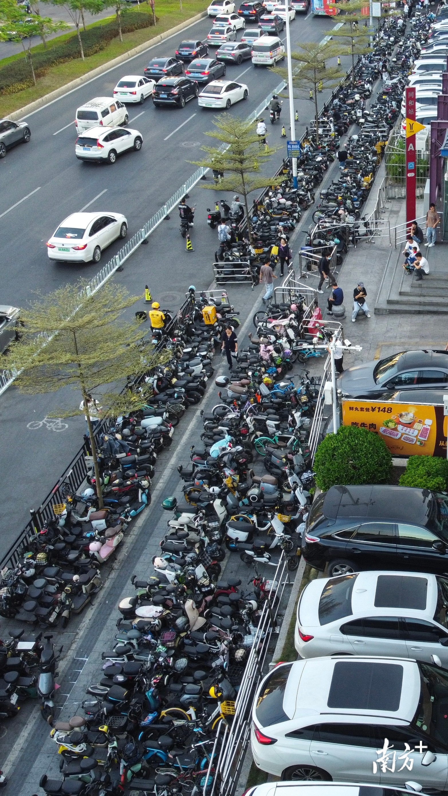 广州嘉禾望岗地铁站外,停放区停放着大量电动自行车。 南方+记者 郑新洽 摄