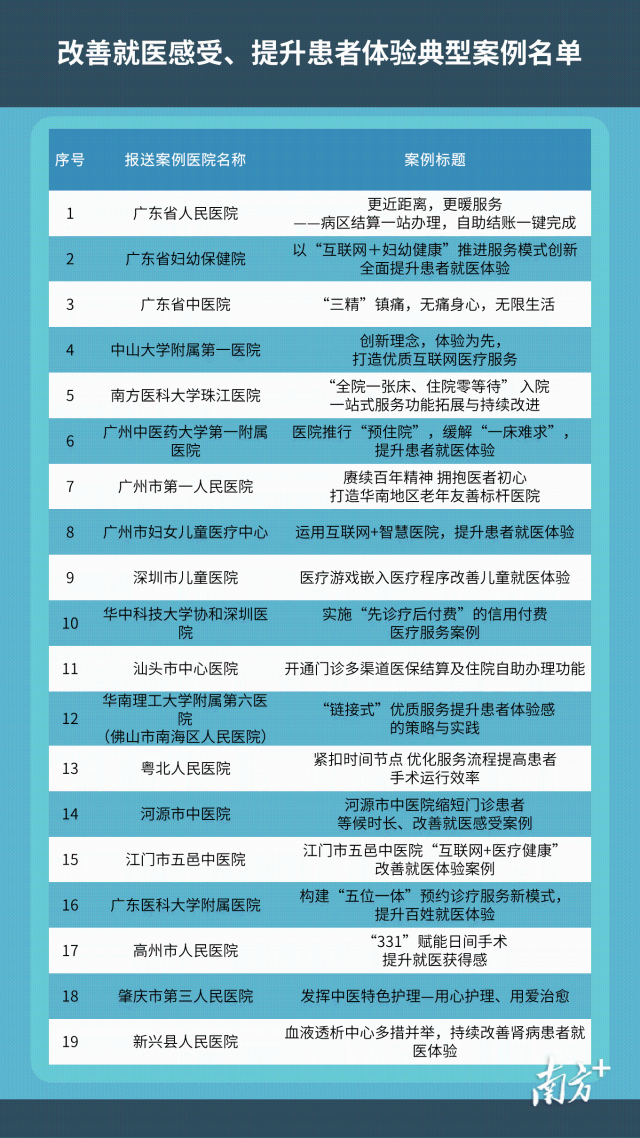 日前,广东省卫生健康委发布改善就医感受提升患者体验典型案例,省人民医院、省妇幼保健院、深圳市儿童医院等单位的19个案例入选,相关经验做法将向全省医疗机构进行宣传推广。